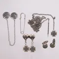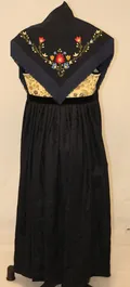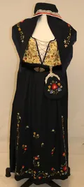 Rogalandsbunad dame, lengde 141cm, liv 99cm, forkle, sjal, lue, veske, belte, kjede, 2 søljer, 1 par mansjettknapper, sjalkjede/nål. Kan utvides. Levert av Nordaker bunader AS. Kontakt Lånekontoret for frakt.