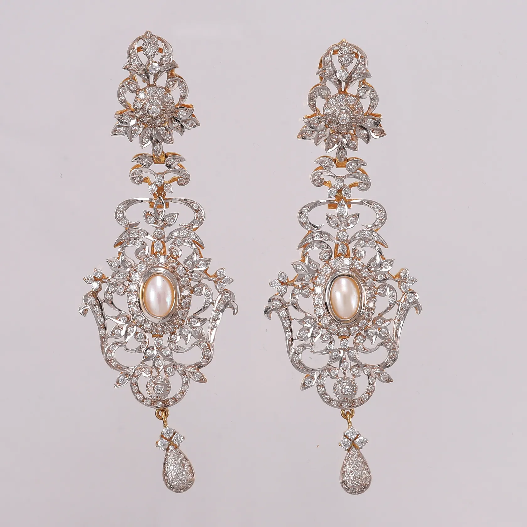 Ett par øredobber, med perler og klare stener, 100x35mm, 21K tot. Utstilt på Grønland. Vekt: 39,7 g. Kontakt Lånekontoret for frakt.