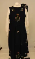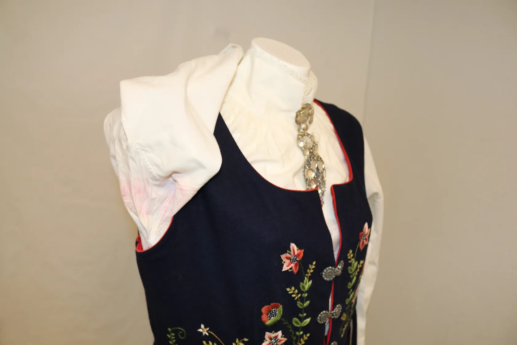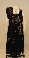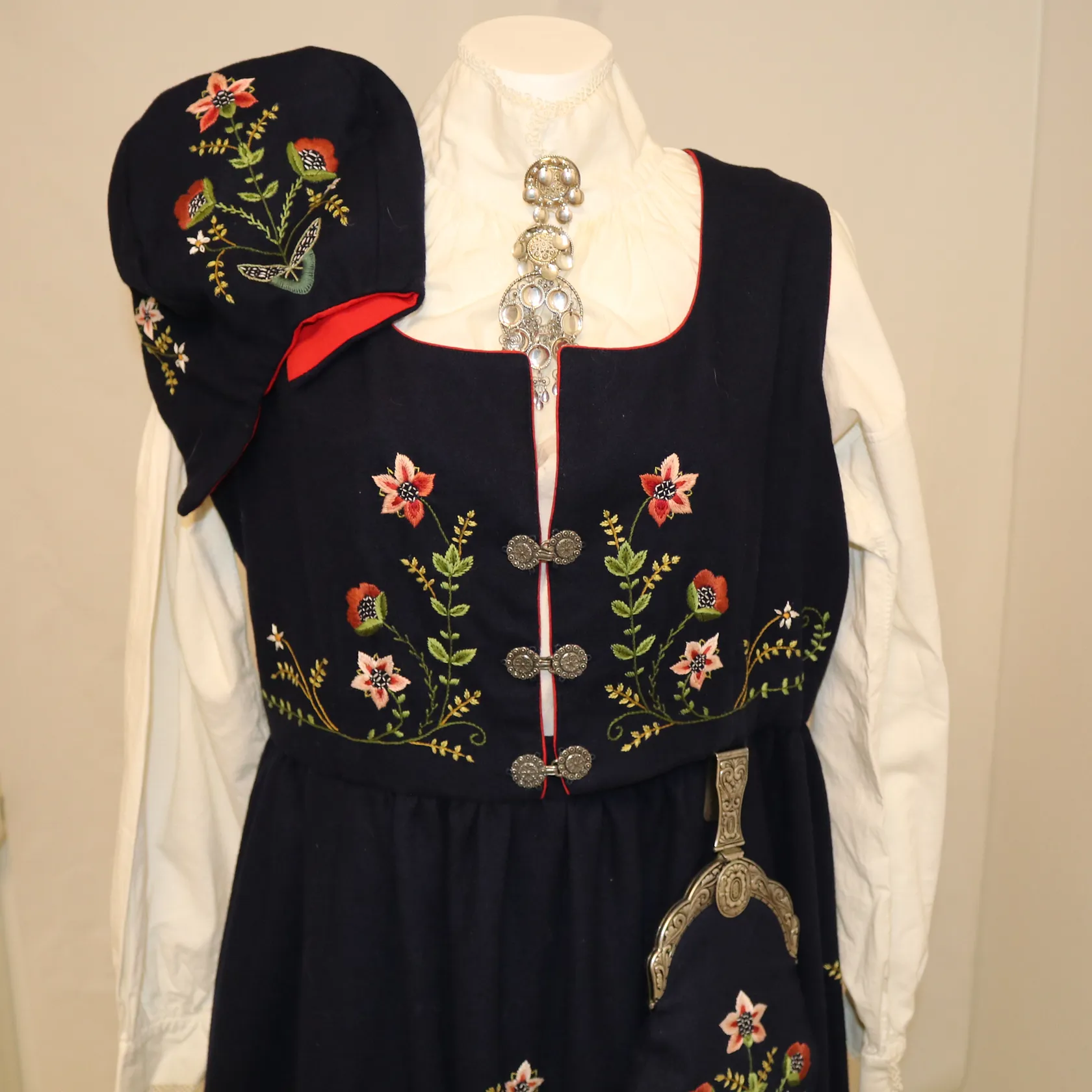 Valsetbunad med skjorte, veske, lue, 3 søljer, 1 par øredobber. Lengde 129cm, liv 94cm, brystvidde 107cm Kontakt Lånekontoret for frakt.