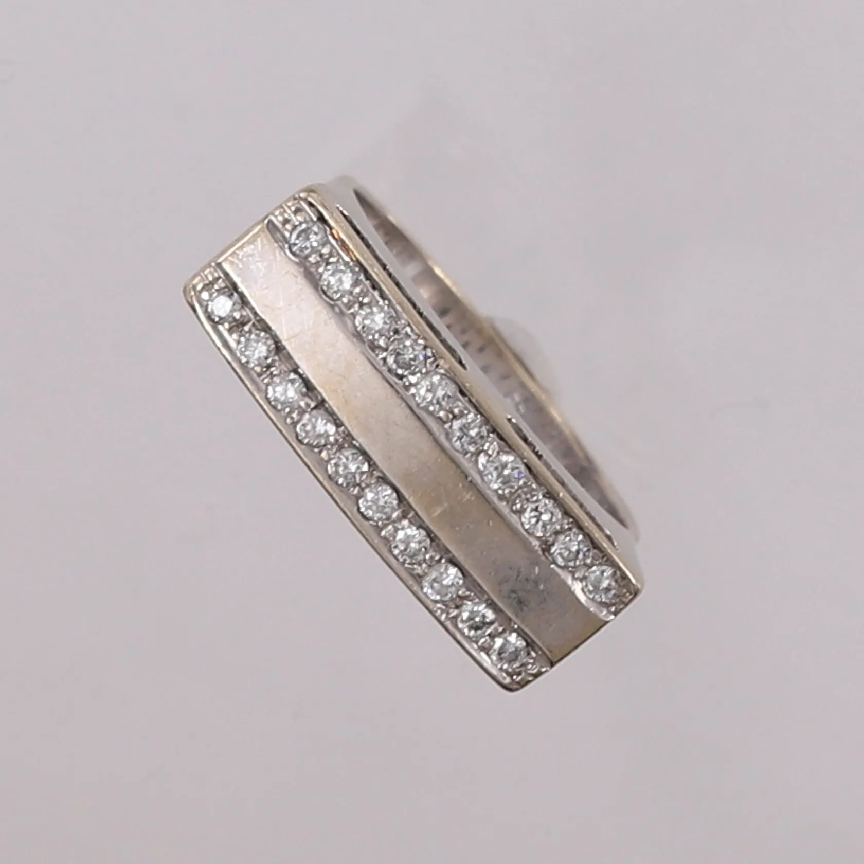 Ring med diamanter 20x ca 0,01ct, ø17,50mm, bredde 3,5-7mm, 18K. Vekt: 7,8 g. Kontakt Lånekontoret for frakt.
