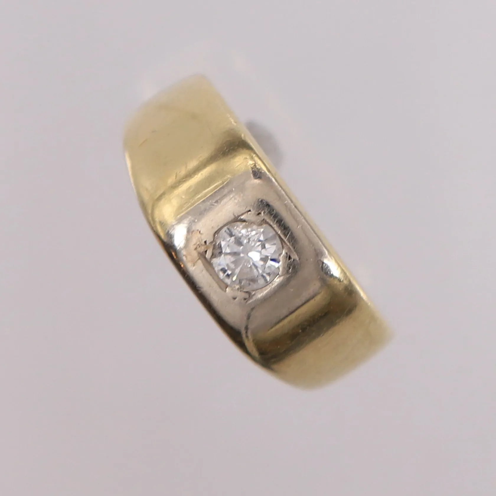 Ring med diamant, ca 0,10ct, ø 18mm, bredde 3-8,4mm, 14K Vekt: 7,6 g. Kontakt Lånekontoret for frakt.