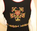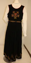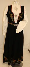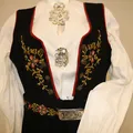 Nedre Buskerud Bunad, skjorte, belte med sølvspenne, 3 søljer, et par manjettknapper. Lengde 137cm, liv ca 85 cm. Hull foran på skjørtet, sydd for hånd. Hull foran på skjorten. Kontakt Lånekontoret for frakt.