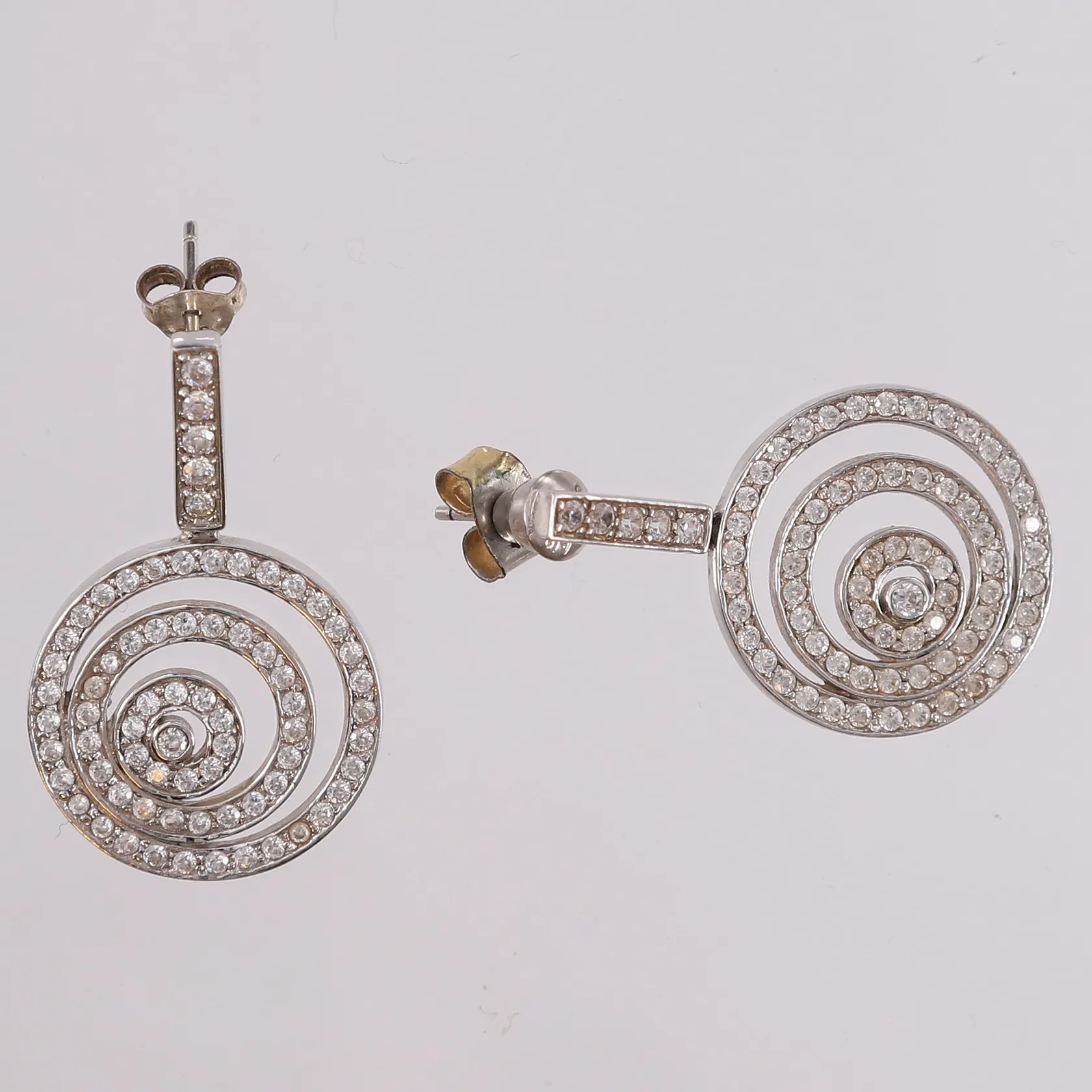 Ett par øredobber med blanke stener, 32x20mm, hvitt gull, (totalt 3 stoppere; én sølv, én gull og én "uekte"), 14K Vekt: 7,7 g. Kontakt Lånekontoret for frakt.
