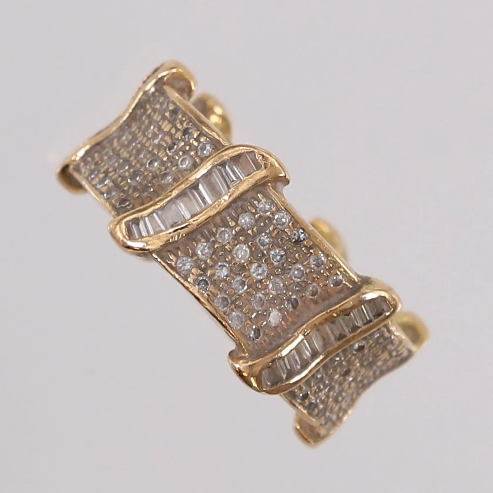 Ring med diamanter (149 små briljantslipte og 48 baguetteslipte á ca. 0,02ct), ø17,1mm, bredde 7,8- 10,3mm, mangler én briljantslipt sten, 18K Vekt: 9,3 g. Kontakt Lånekontoret for frakt.