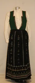 Nordfjord-bunad (ca. str. 38) med skjorte og forkle. Lengde 141cm, liv-vidde 74cm, brystvidde 82cm Kontakt Lånekontoret for frakt.