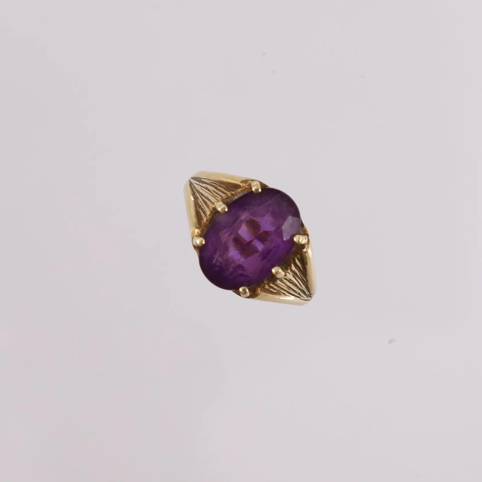 Ring med lilla sten, ø17,25mm, bredde 2mm, 14K. Vekt: 5,7 g. Kontakt Lånekontoret for frakt.