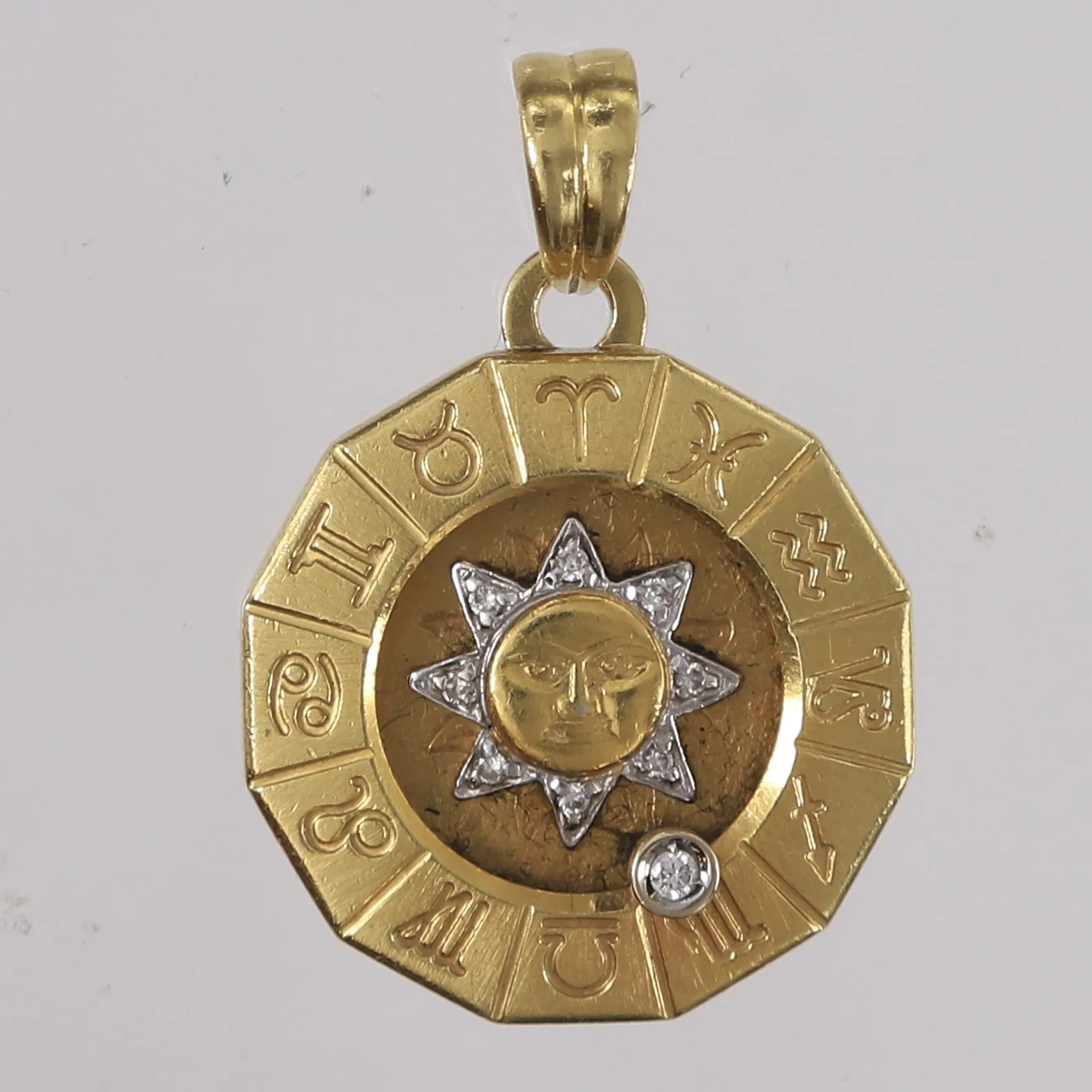 Anheng med diamanter (1 x ca. 0,02ct og 8 små diamanter/blanke stener), to-farget, ø23mm, 18K Vekt: 8,2 g. Kontakt Lånekontoret for frakt.