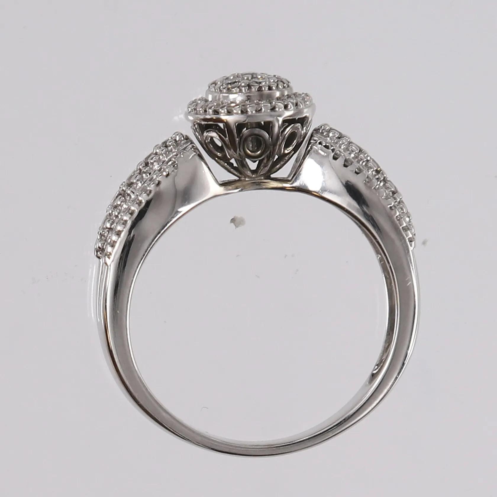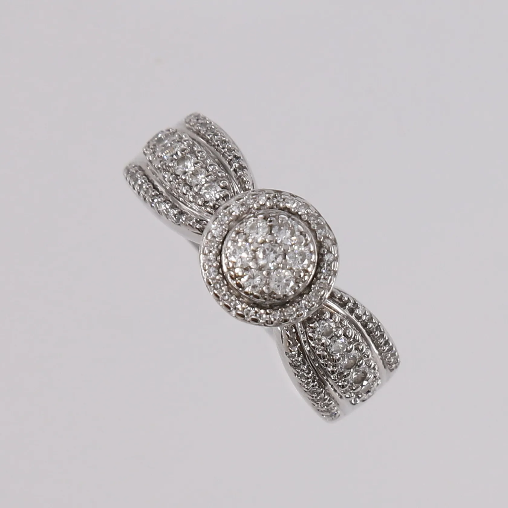 Ring med 85 briljantslipte diamanter (totalt ca. 1,05ct W / SI), ø18,5mm, bredde 3- 9,2mm, hvitt gull, 14K Vekt: 6,9 g. Kontakt Lånekontoret for frakt.