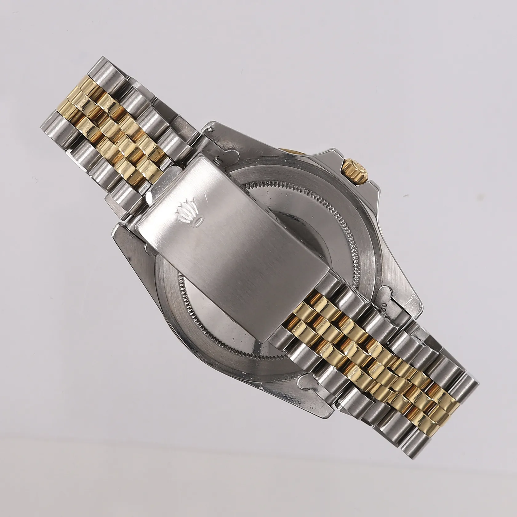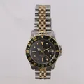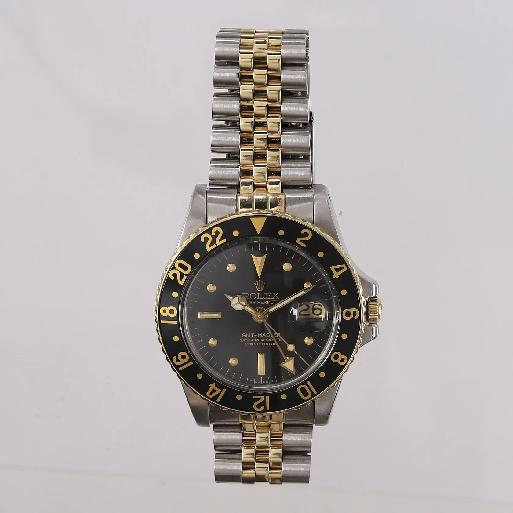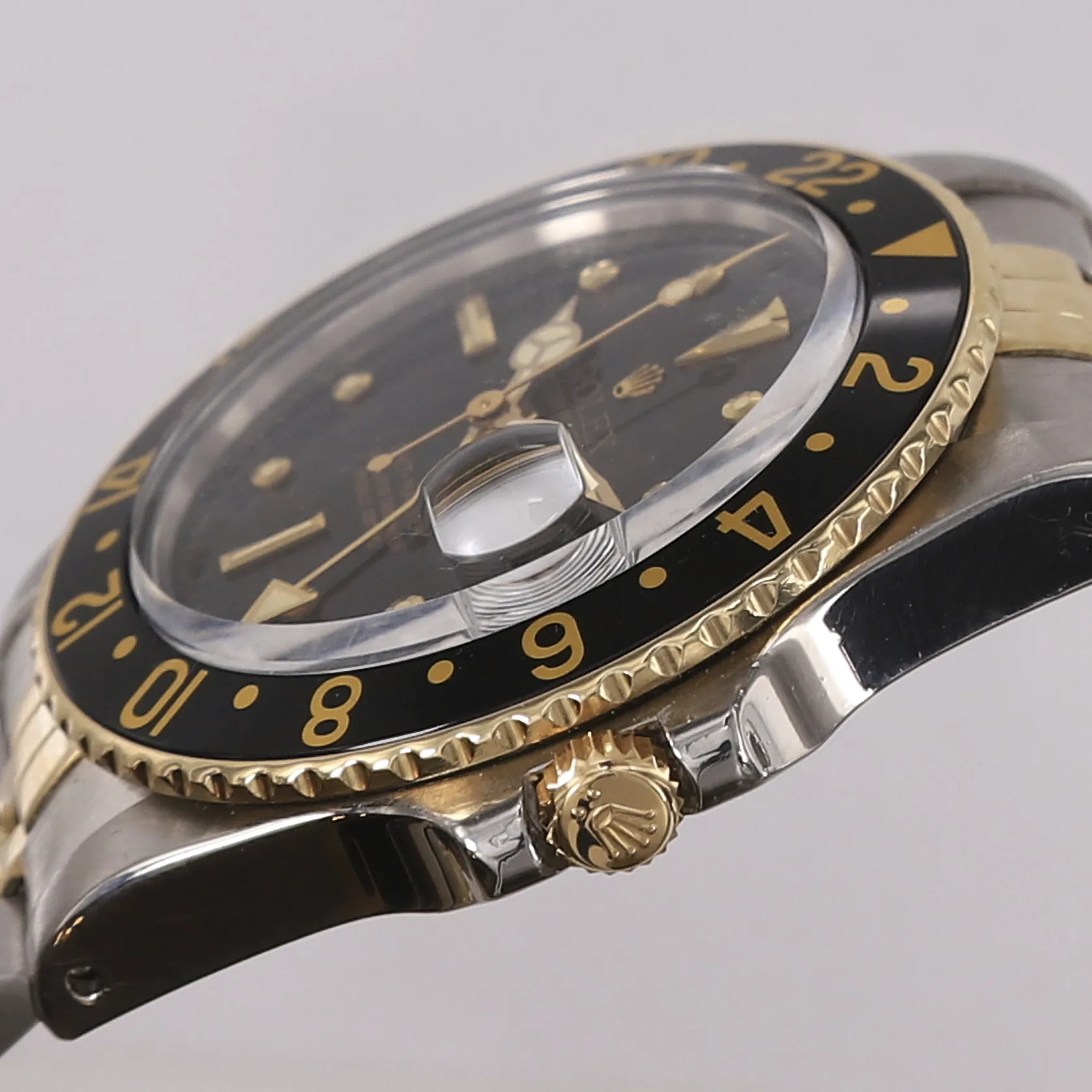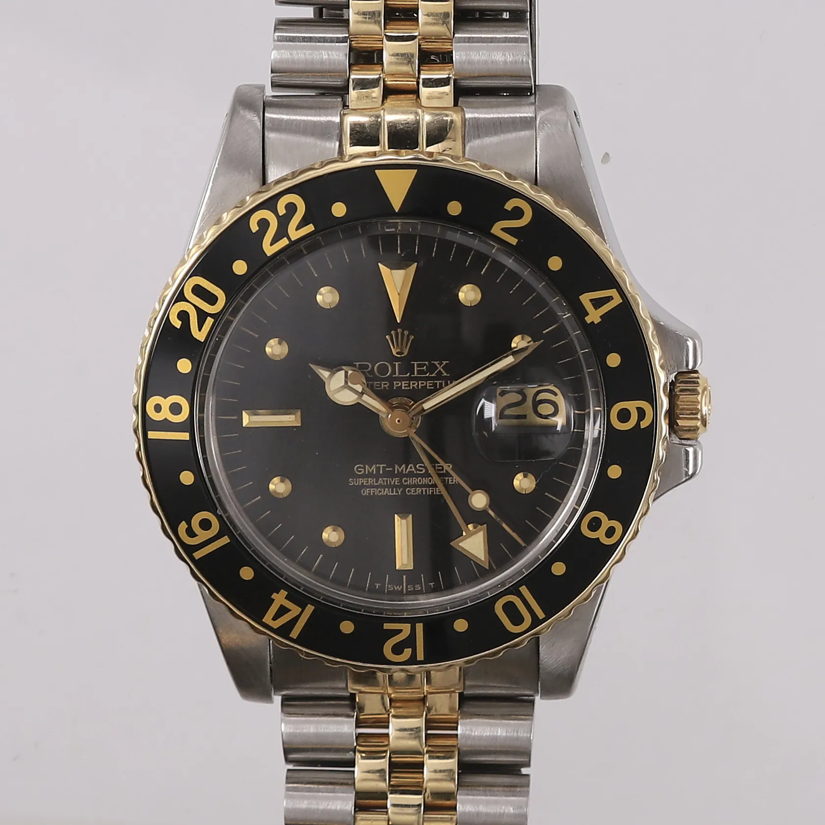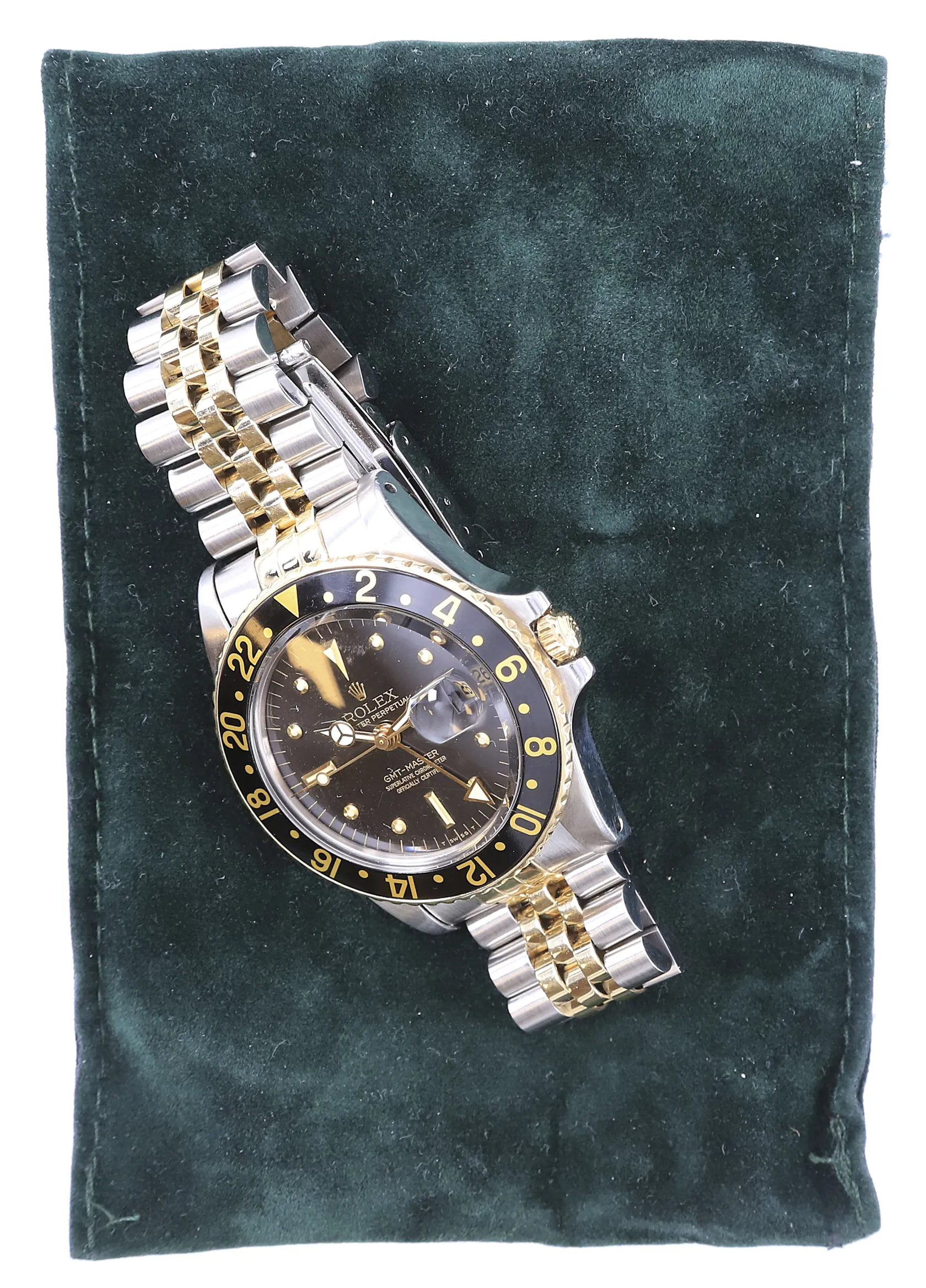 Rolex GMT-Master, ø40mm, stål/gull, ref 1675, snr 5204672, boettnr 1675, verknr D416332, cal 1570, år ca 1977, plexiglass, automat, dato, foldelås, lenke stål/gull år ca 1980, transportetui, uten andre tilbehør. Kontakt Lånekontoret for frakt.