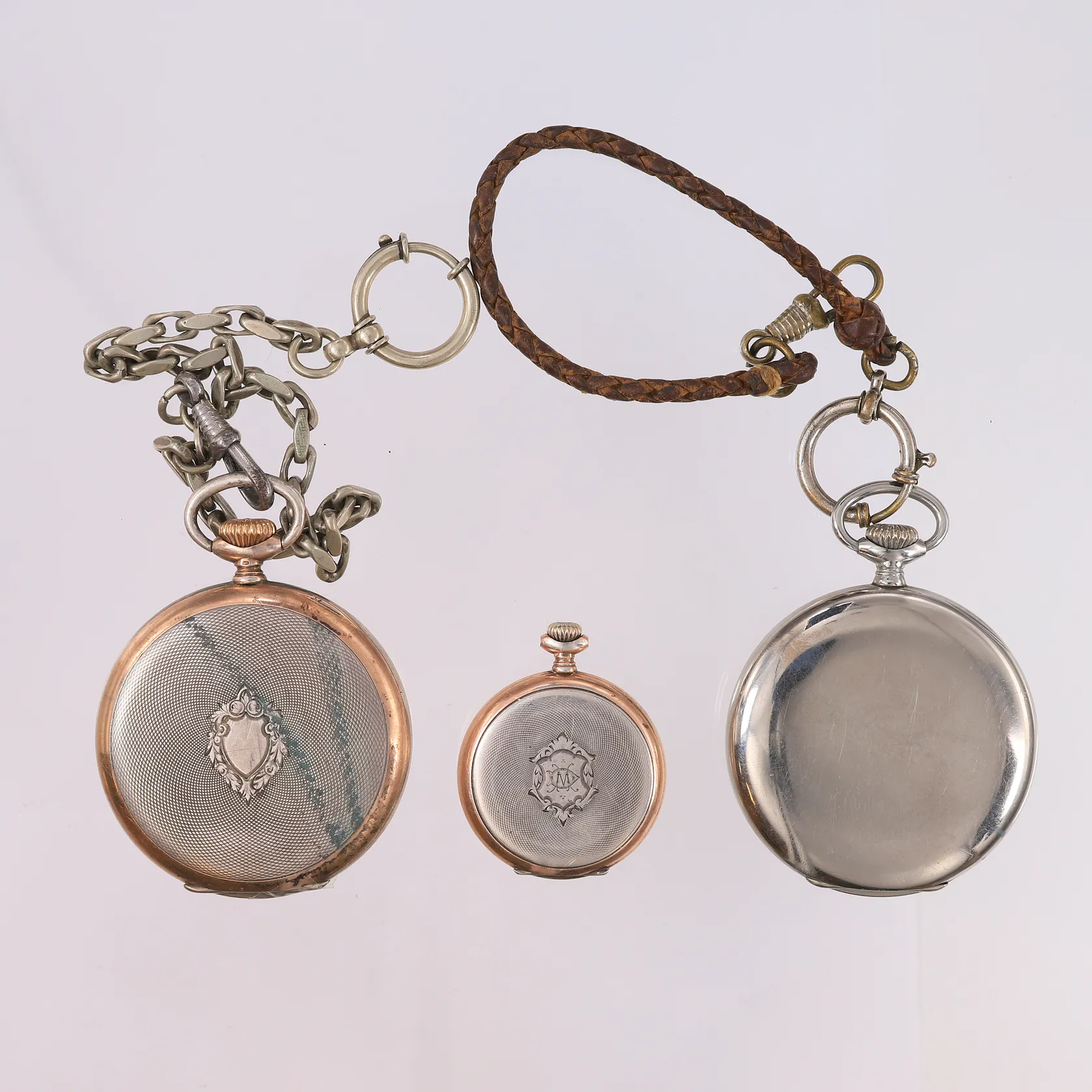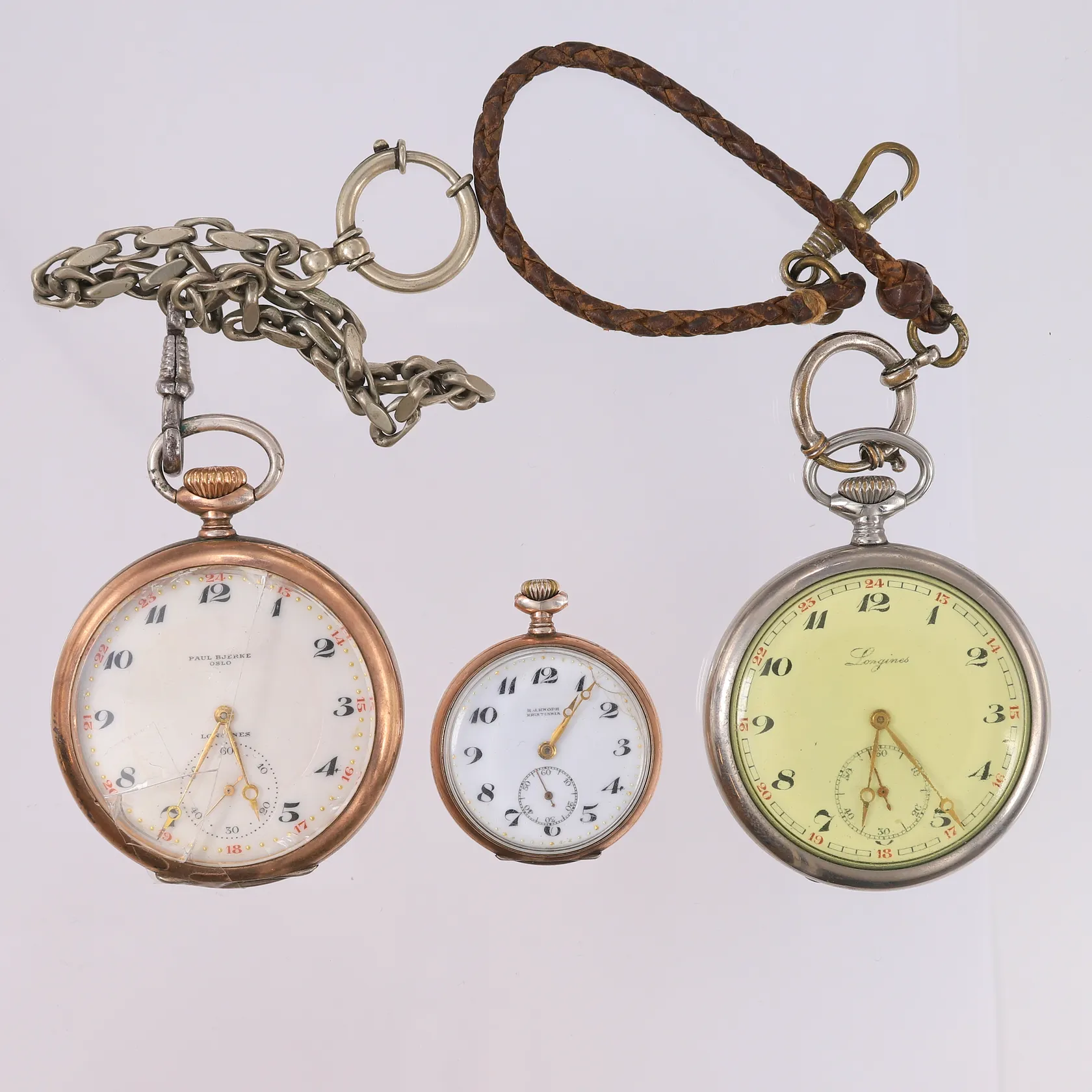 3 stk lommeur, urverk går på alle tre (ikke funksjonstestet forøvrig), ett ur har sprukket glass og ett ur har sprekk i urtavlen, inneholder minimale mengder med gull og sølv Kontakt Lånekontoret for frakt.