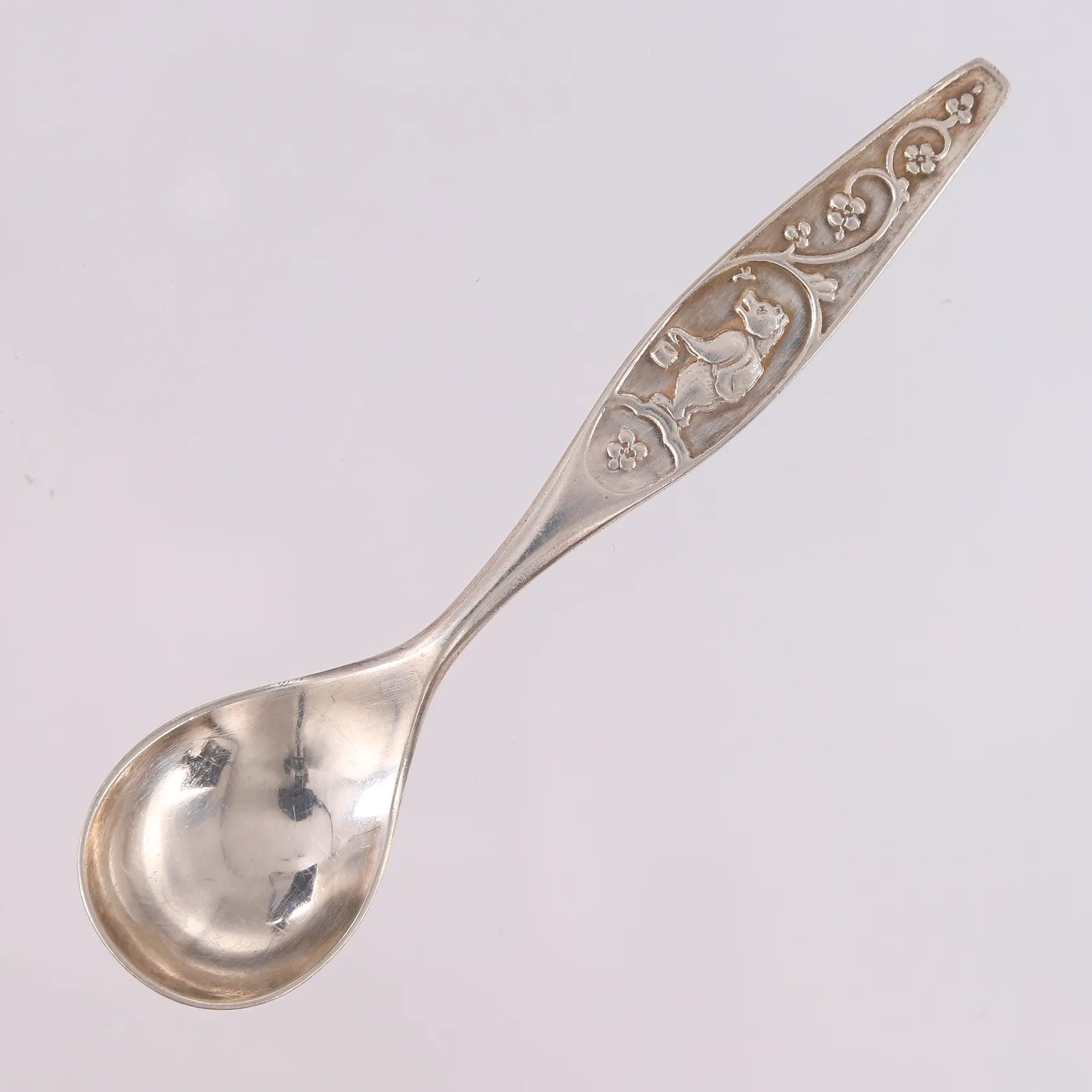 1 liten barneskje, lengde 11,2cm, 830S Vekt: 13,8 g. Kontakt Lånekontoret for frakt.