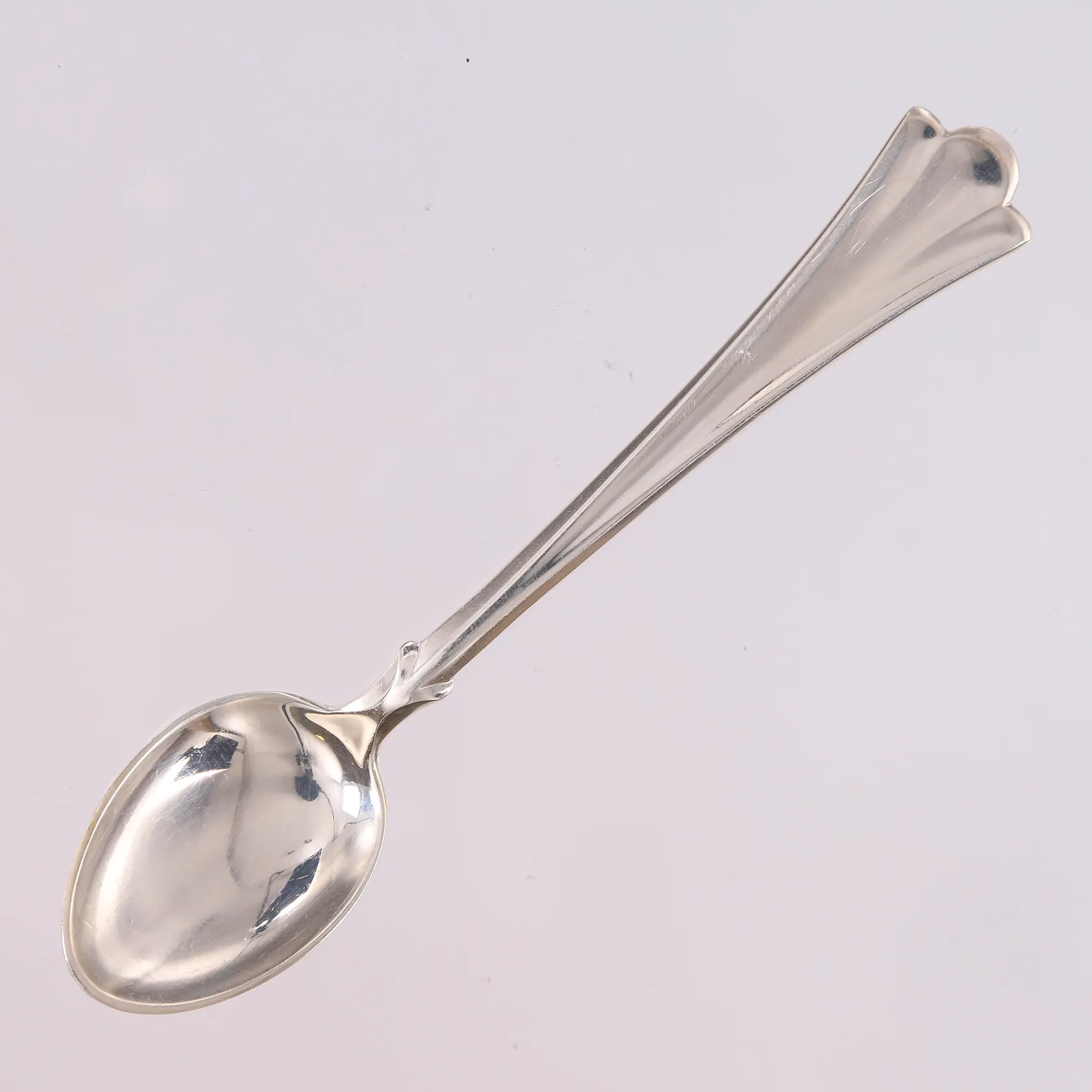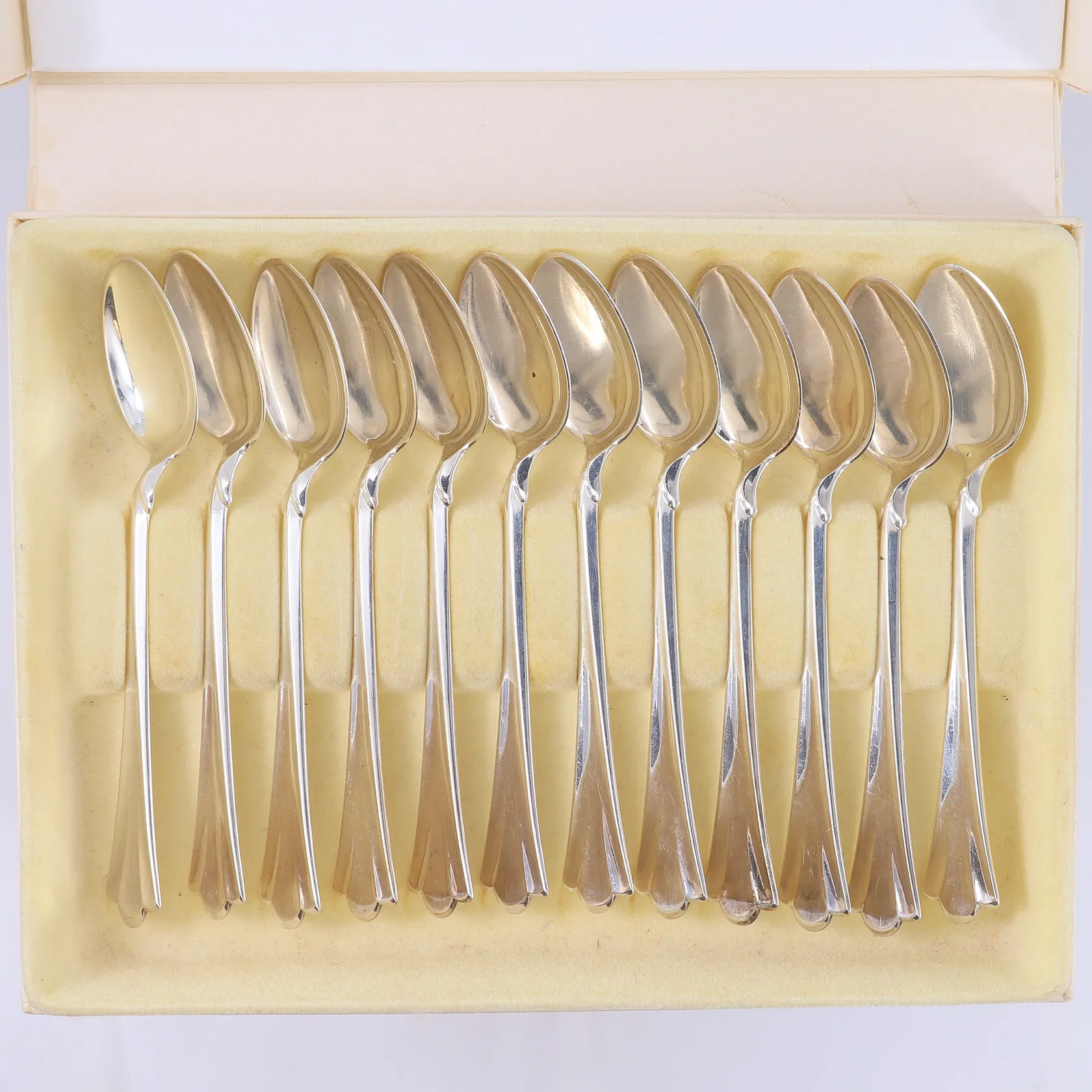 12 teskjeer Lilje, lengde 11,7cm, 830S, med boks fra gullsmed Vekt: 148 g. Kontakt Lånekontoret for frakt.