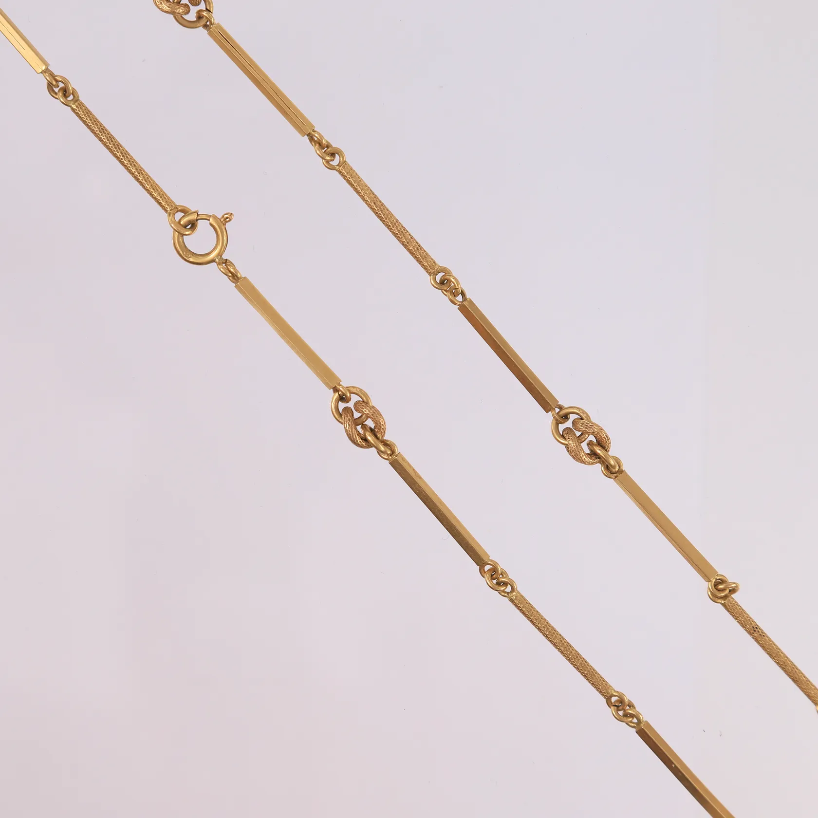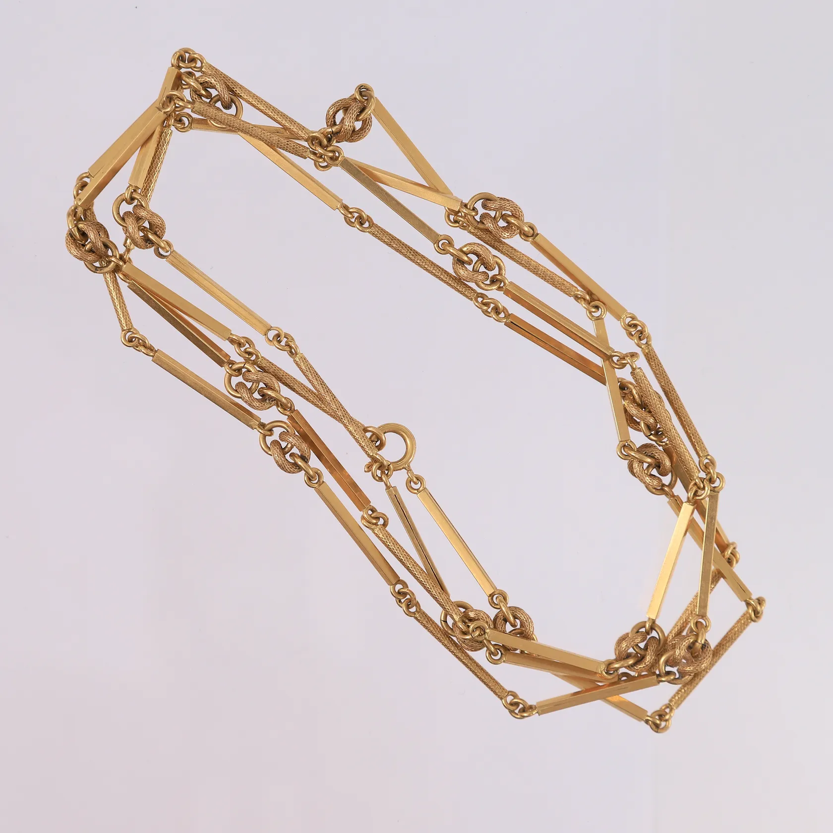 Kjede, lengde 122cm, bredde 1,7- 5,9mm, 18K Vekt: 33,2 g. Kontakt Lånekontoret for frakt.
