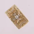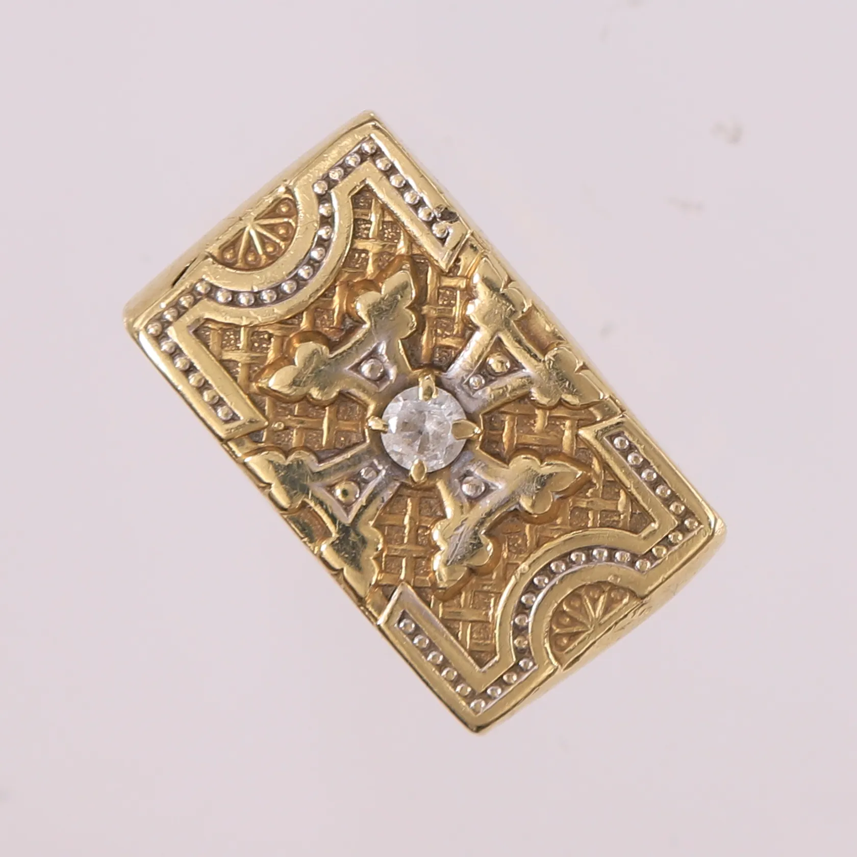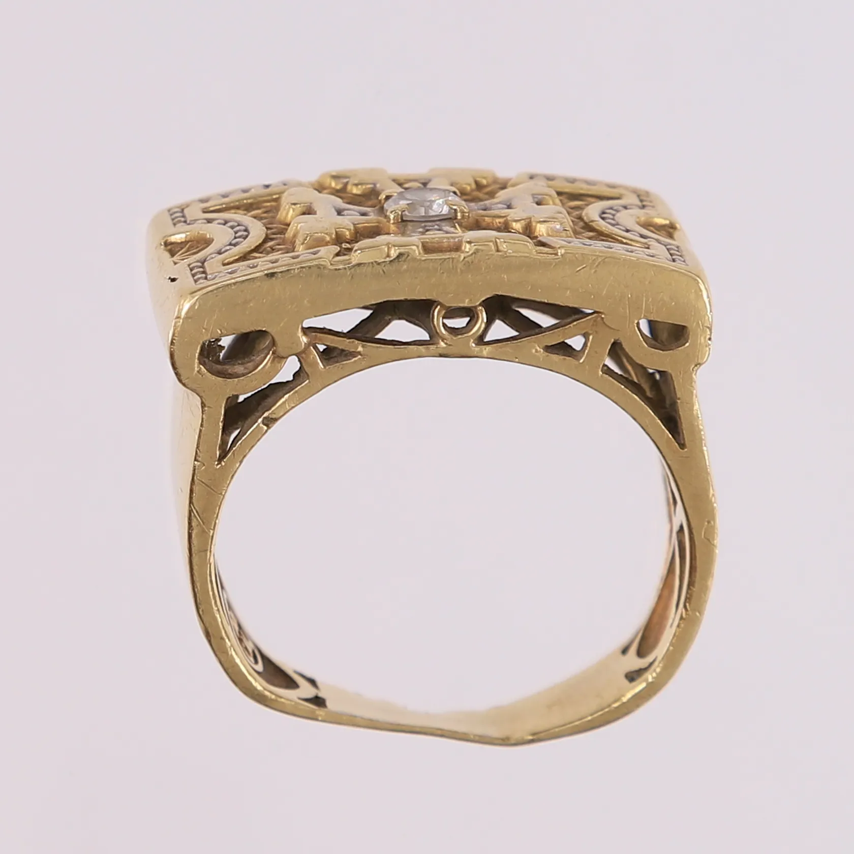 Ring med klar sten, ø19,5 cm, bredde 4,4- 14,8 mm, noe bulkete, 10K. Vekt: 10,9 g. Kontakt Lånekontoret for frakt.