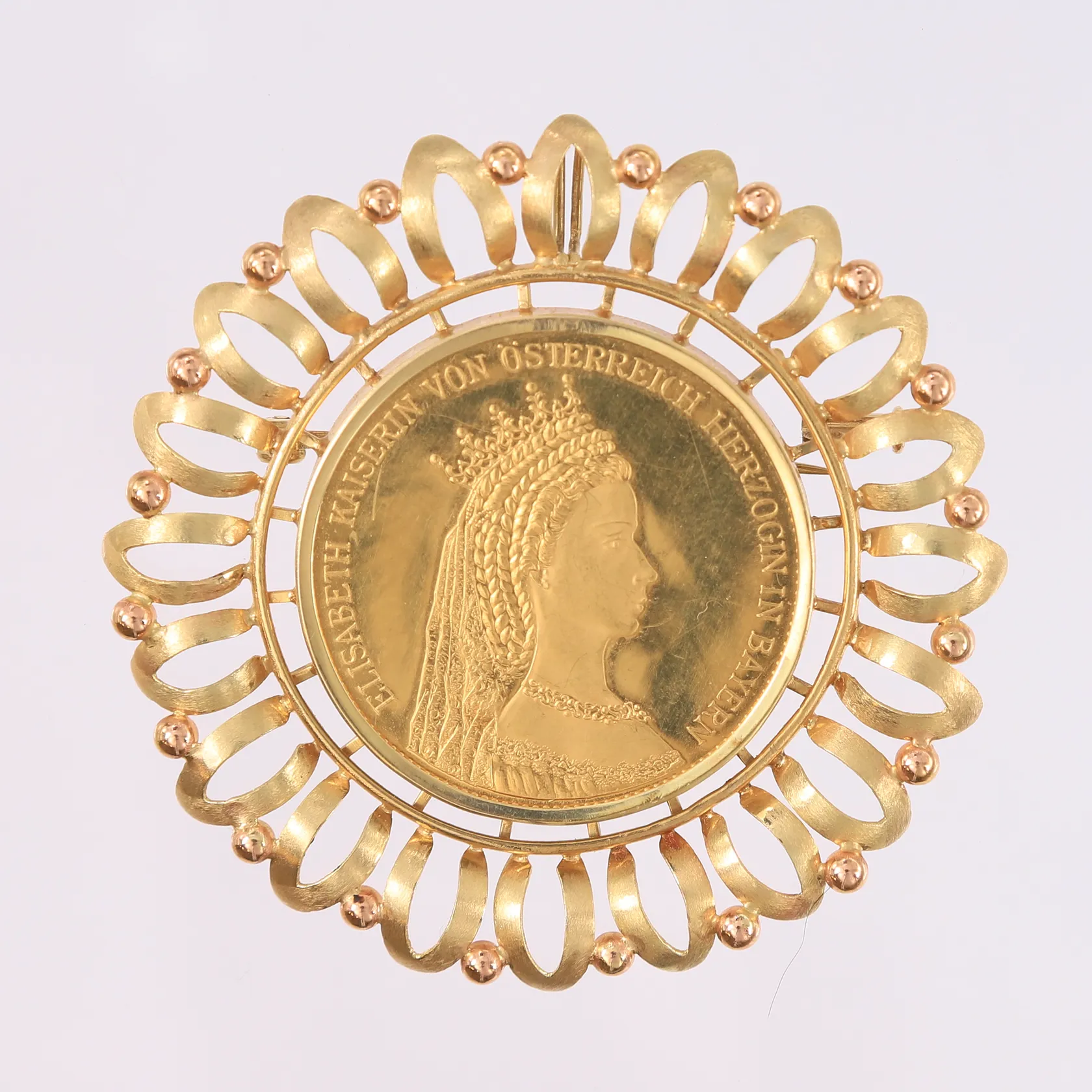 Brosje med mynt (mynten er 21K), Elisabeth av Østerrike, ø60 mm, 14K. Vekt: 24,1 g. Kontakt Lånekontoret for frakt.