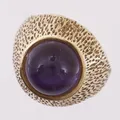 Ring med lilla sten, ø 15,5mm, bredde 4 - 16mm, 14K Vekt: 8,1 g. Kontakt Lånekontoret for frakt.