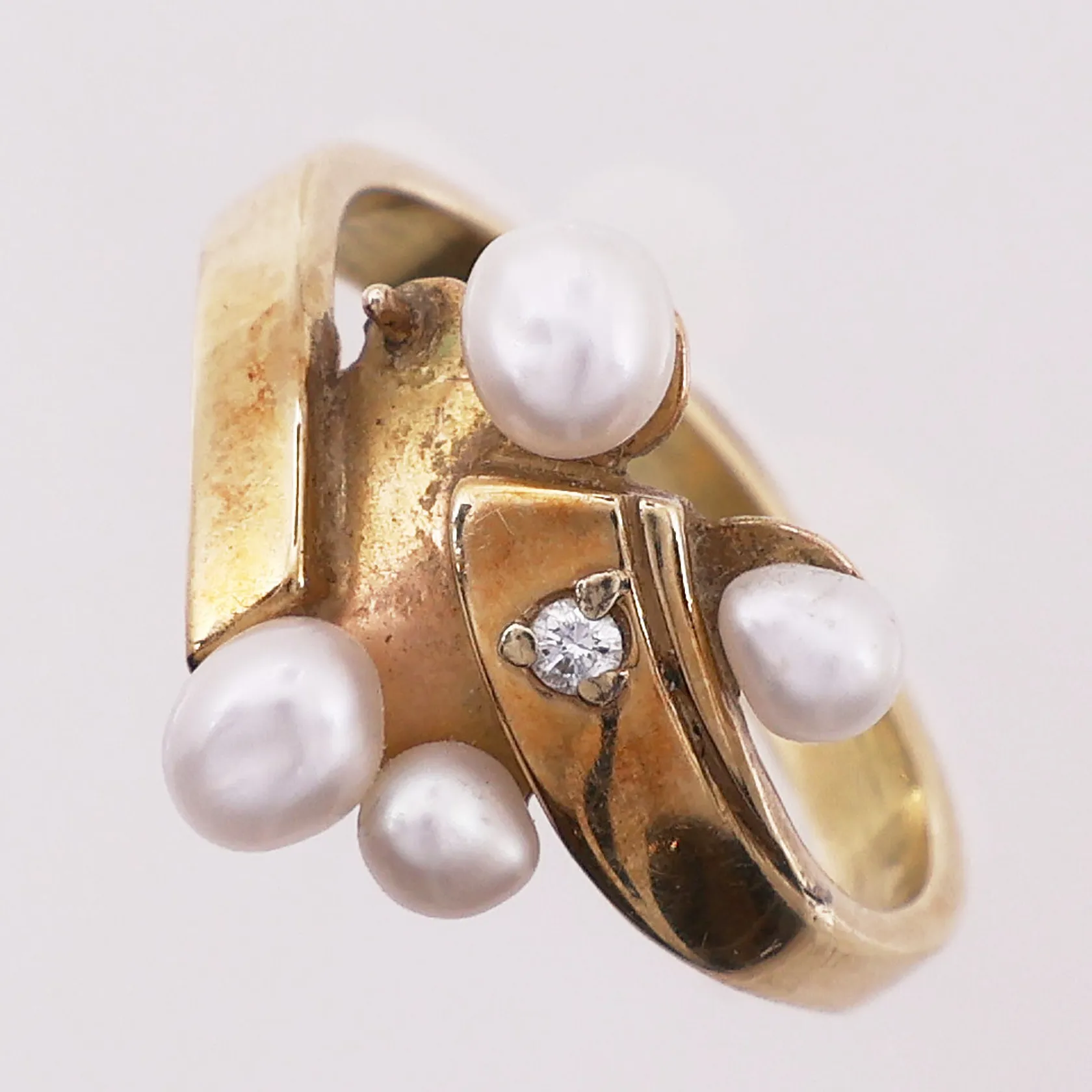 Ring med perler, 1 diamant ca 0,01ct, ø 16,5mm, bredde 3 - 13mm, mangler 1 perle, 14K Vekt: 3,6 g. Kontakt Lånekontoret for frakt.