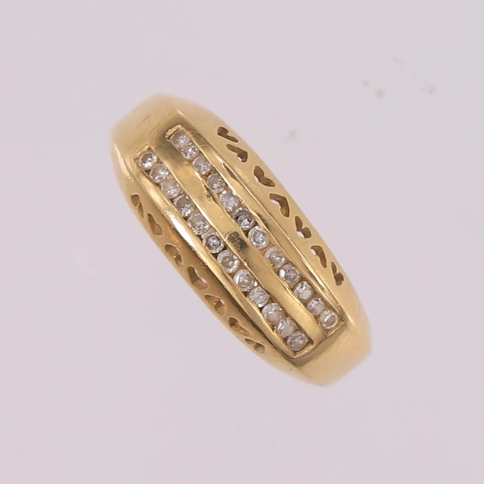Ring med diamanter (24 x ca. 0,01ct), ø17,5mm, bredde 2,9- 8,2mm, 14K Vekt: 3,9 g. Kontakt Lånekontoret for frakt.