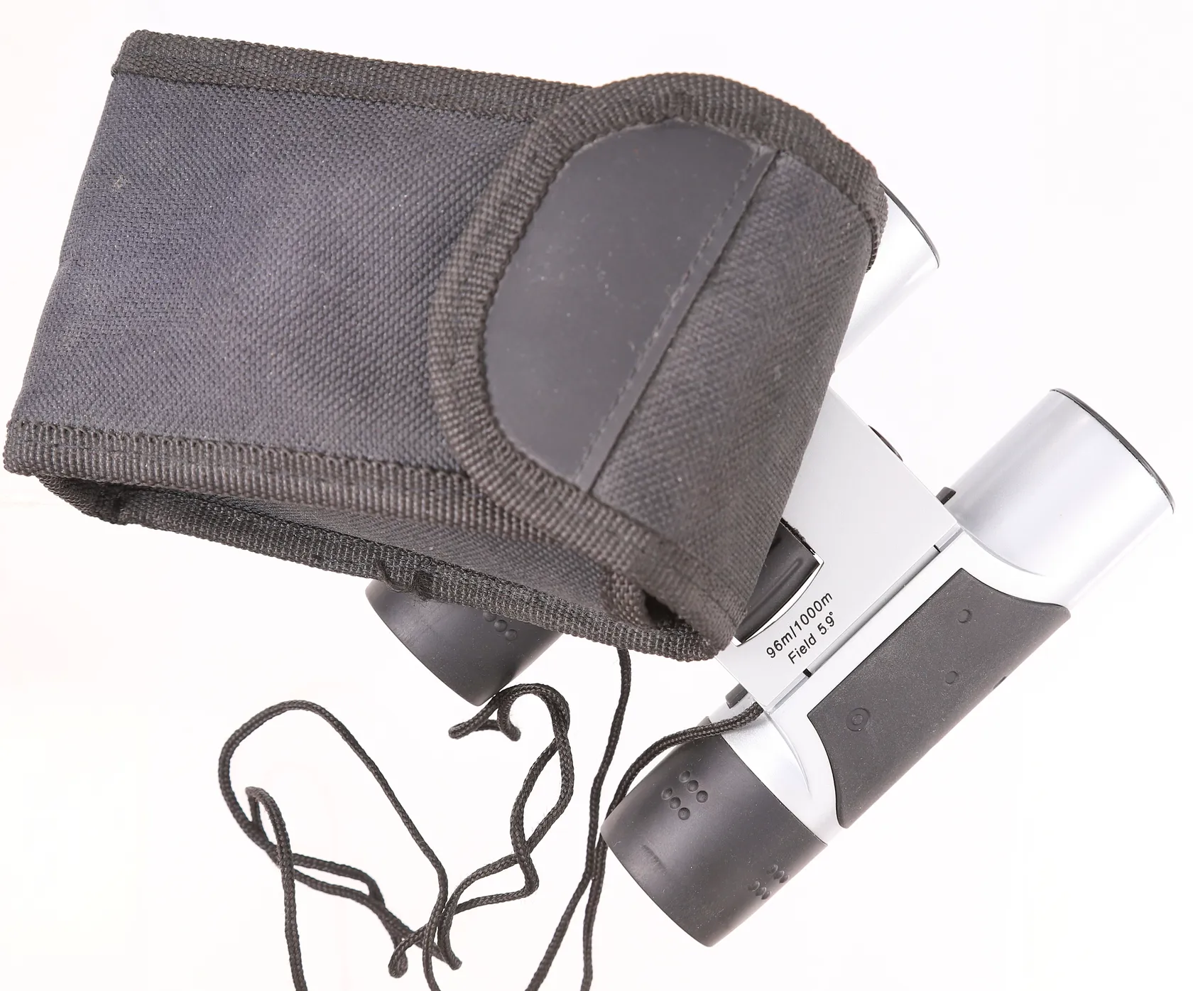 Kikkert, 10x25 (10 ganger forstørrelse, objektivdiameter 50mm), 96m/1000m, field 5.9°, med softbag og pusseklut Kontakt Lånekontoret for frakt.