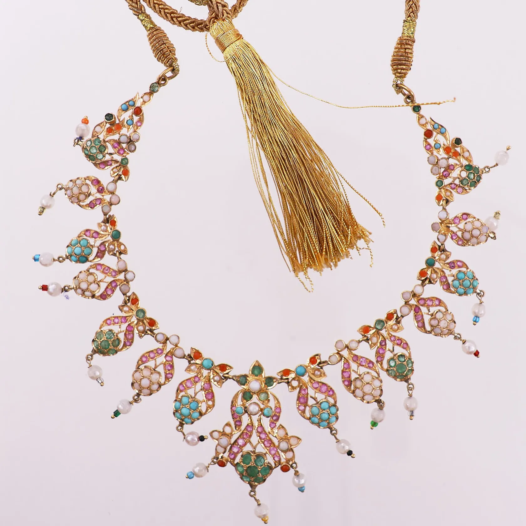 Halskjede med gulltråd og fargede stener, lengde 35cm, bredde 3-30mm, bruttovekt 46,2g, (mangler noen stener), 21K, Vekt: 46,2 g. Kontakt Lånekontoret for frakt.