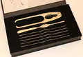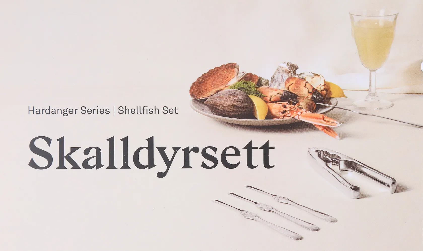 Skalldyrsett i 7 deler, bestående av 6 skalldyrgafler og 1 knekker. Hardangerbestikket fremstår som nytt. Kontakt Lånekontoret for frakt.