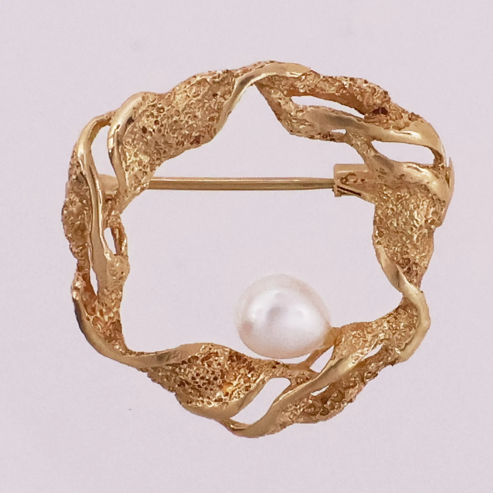 Brosje med perle, lengde 23,5 mm, bredde 5,9 mm, 14K Vekt: 2,4 g. Kontakt Lånekontoret for frakt.