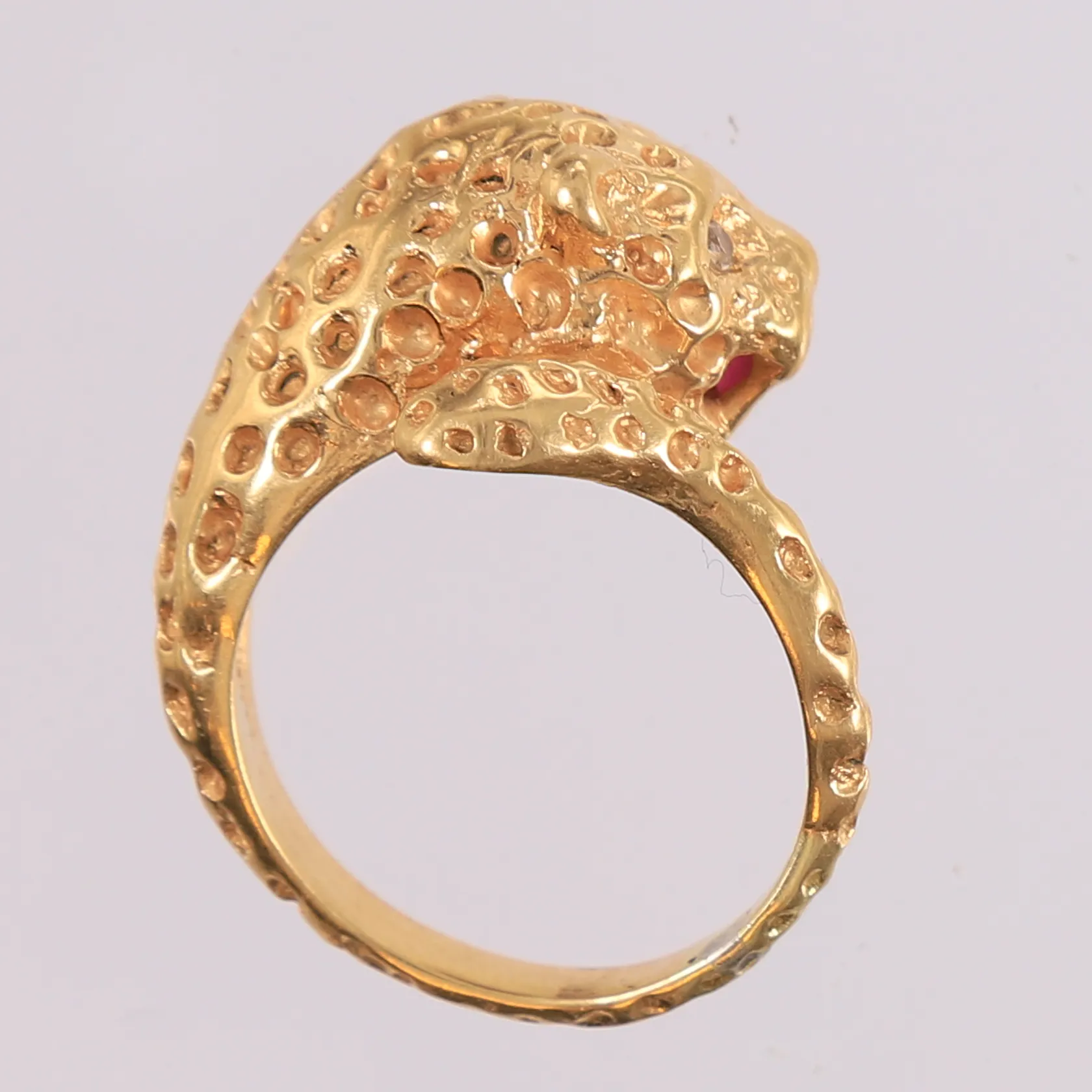Ring med to klare stener og én rubin, 18K. Vekt: 15,9 g. Kontakt Lånekontoret for frakt.