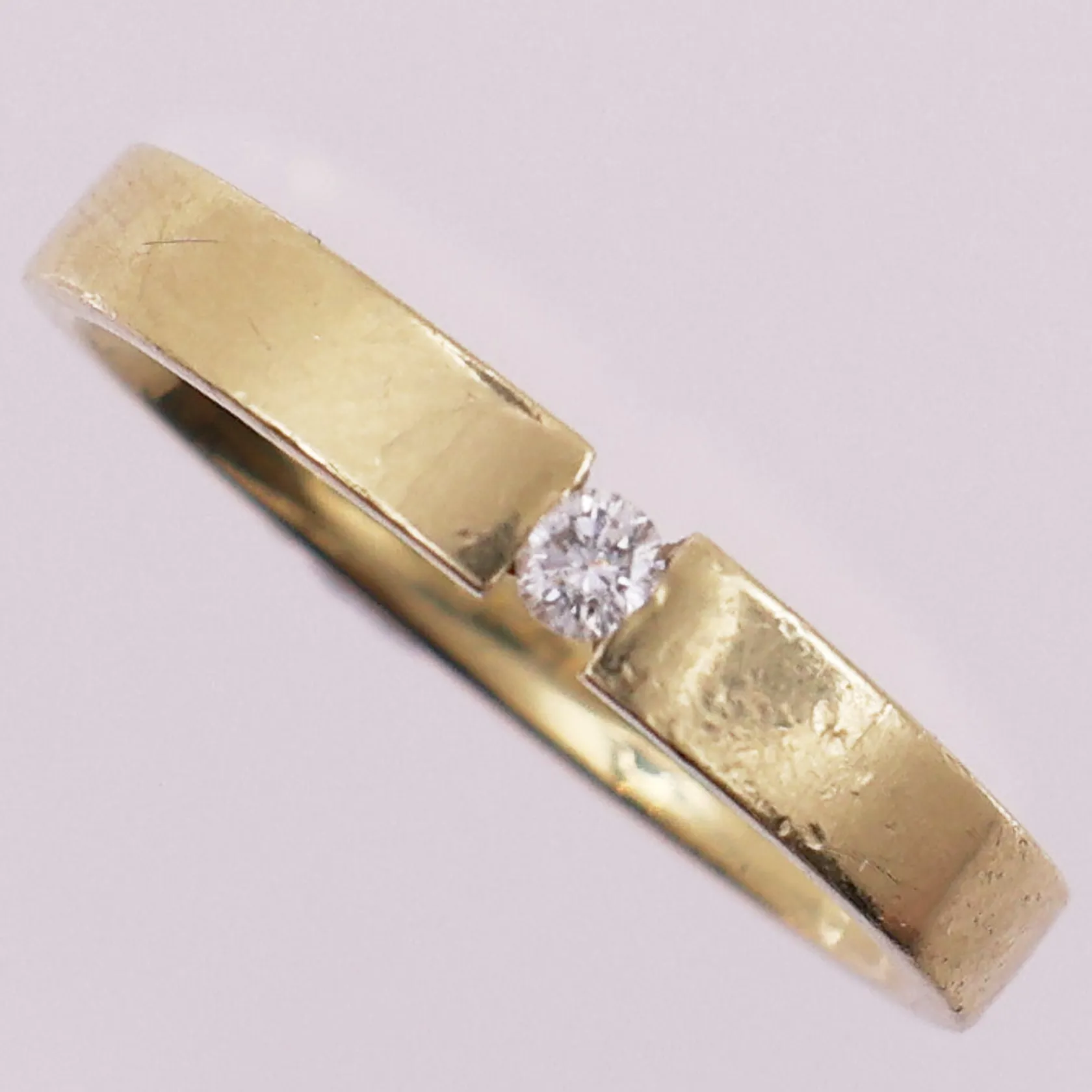 Ring med diamant, 1 x ca 0,08 ct, Ø 20,1 mm, bredde 3,6 mm, noe løs diamant, 18K Vekt: 6,9 g. Kontakt Lånekontoret for frakt.