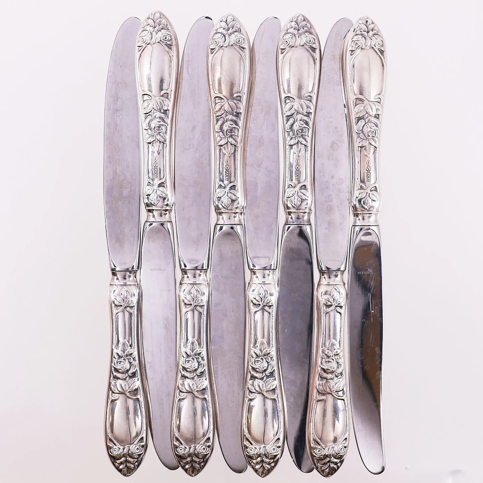 8 spisekniver i opphøiet rose, lengde 22cm, Th. Marthinsen, 830S Vekt: 661,5 g. Kontakt Lånekontoret for frakt.