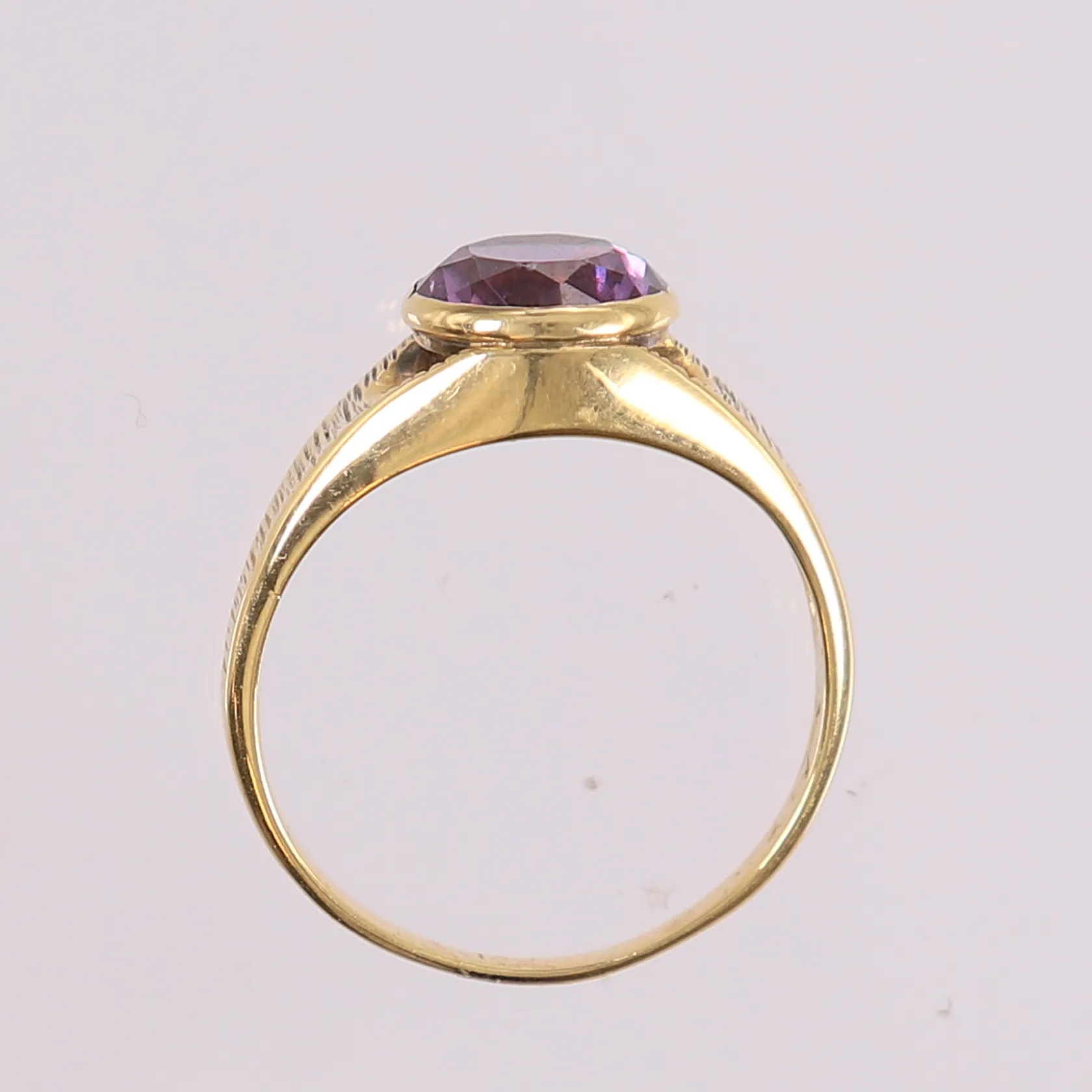 Ring med lilla sten, ø 17mm, bredde 1,5 - 8,5mm, 14K Vekt: 3 g. Kontakt Lånekontoret for frakt.