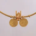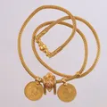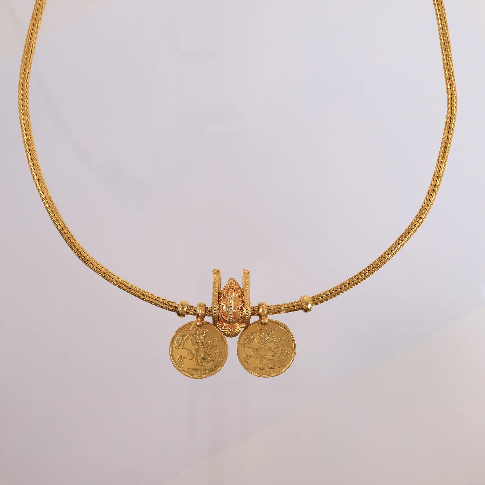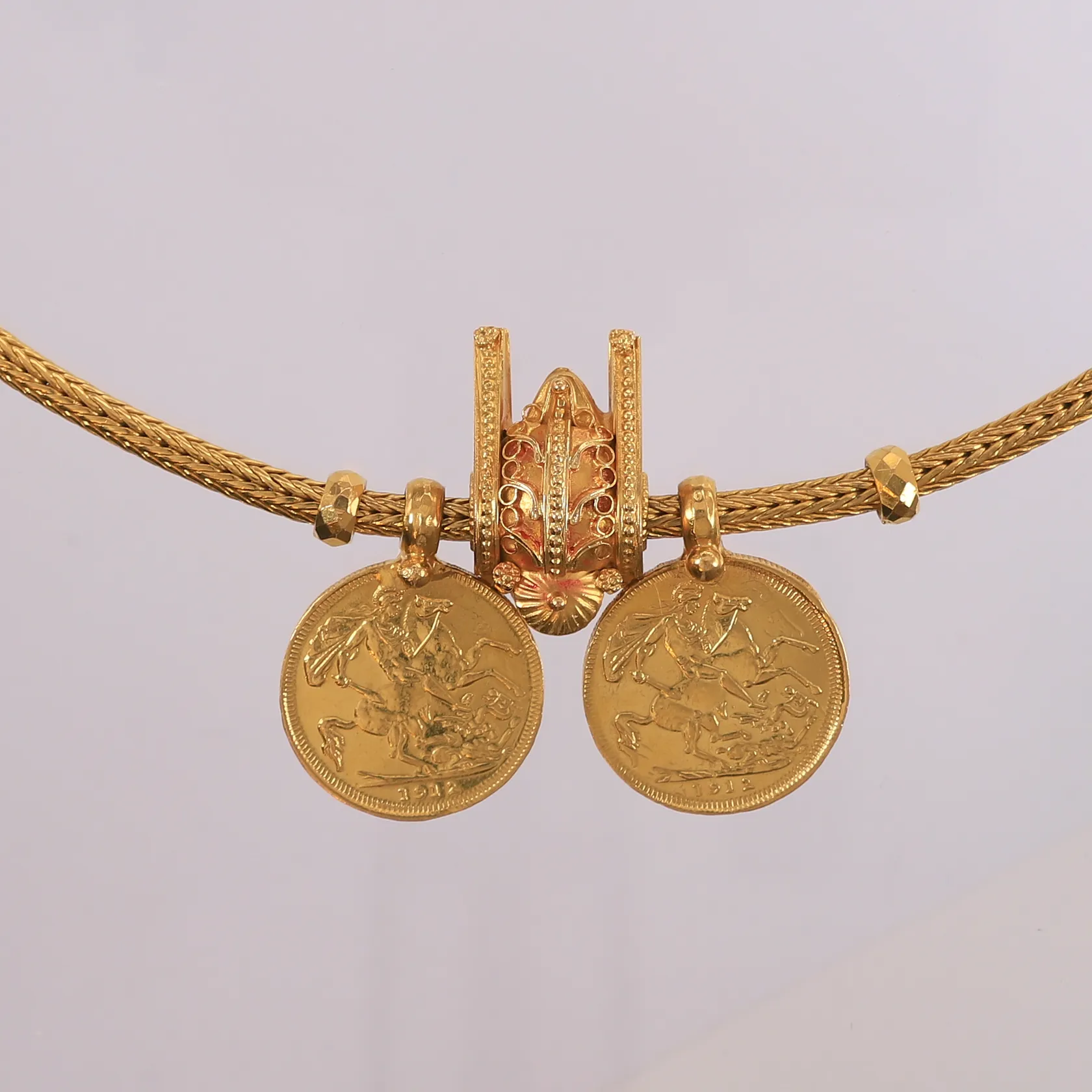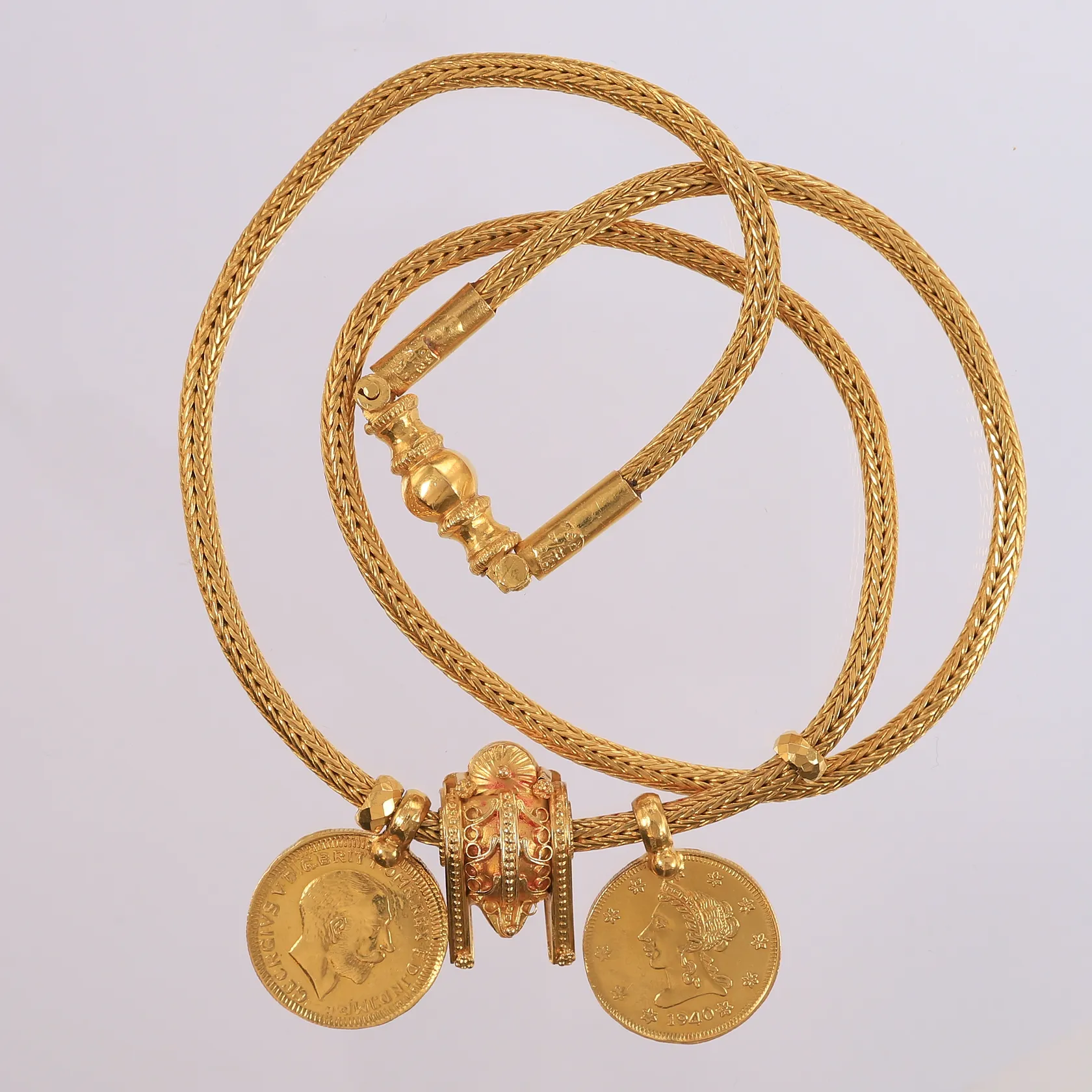 Halssmykke med 3 anheng (2 er mynter), lengde 64cm, bredde 3,8- 30mm, 22K Vekt: 120,1 g. Kontakt Lånekontoret for frakt.
