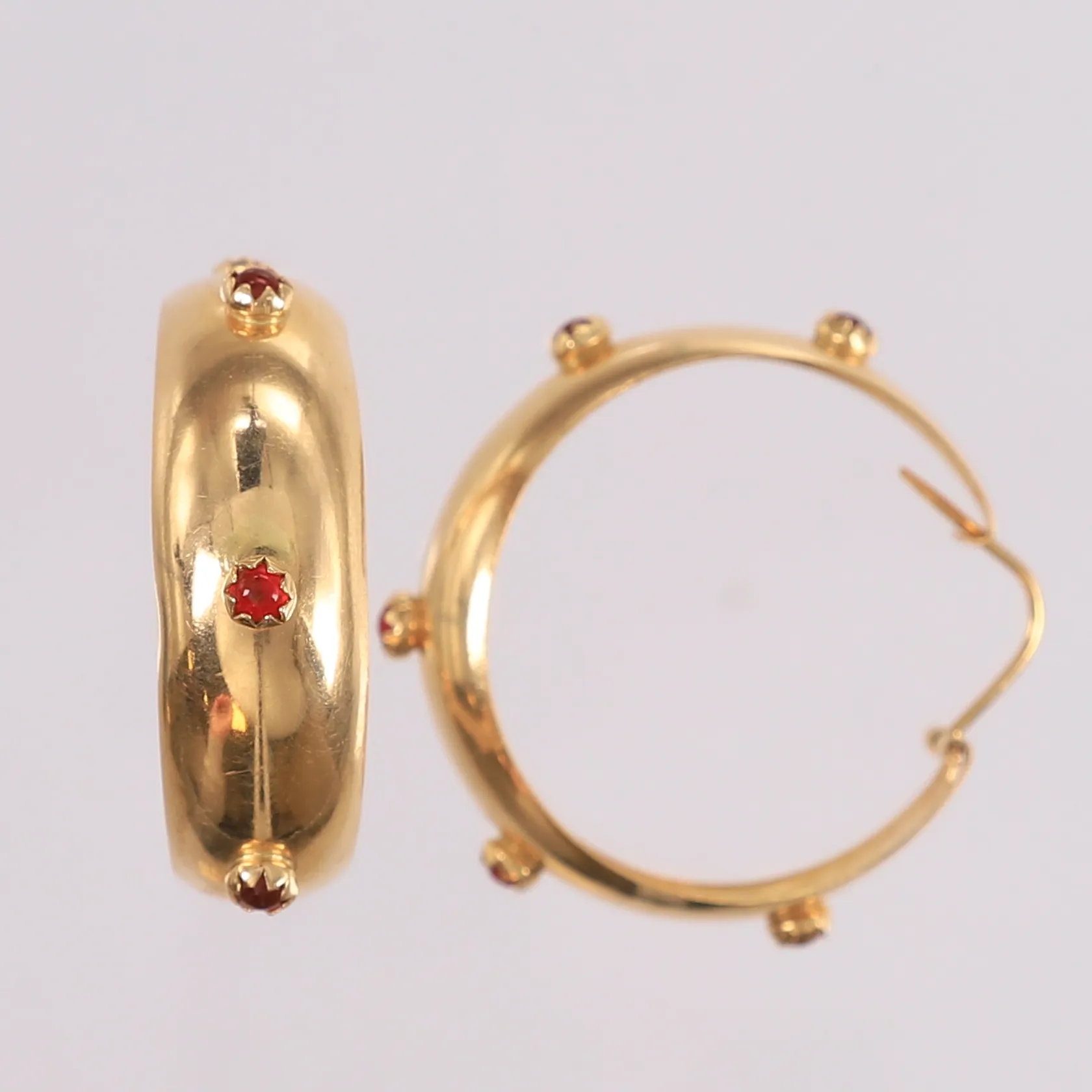 Ett par øredobber med røde stener, ø35mm, bredde 5,3- 10,6mm, 14K, bruttovekt 7,6g Kontakt Lånekontoret for frakt.