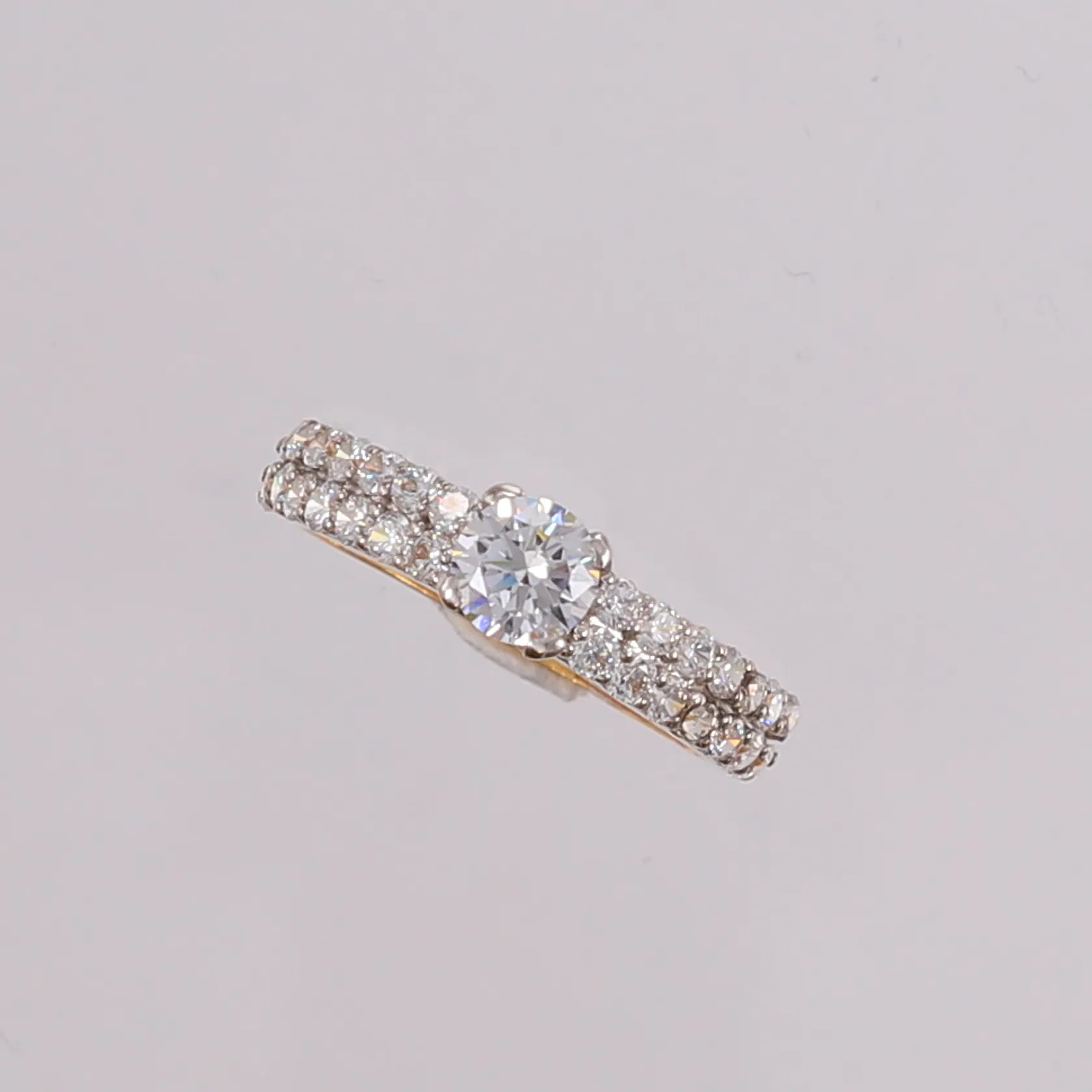 Ring med blanke stener, to-farget, ø17,8mm, bredde 2,2- 5,5mm, 20K Vekt: 2,9 g. Kontakt Lånekontoret for frakt.