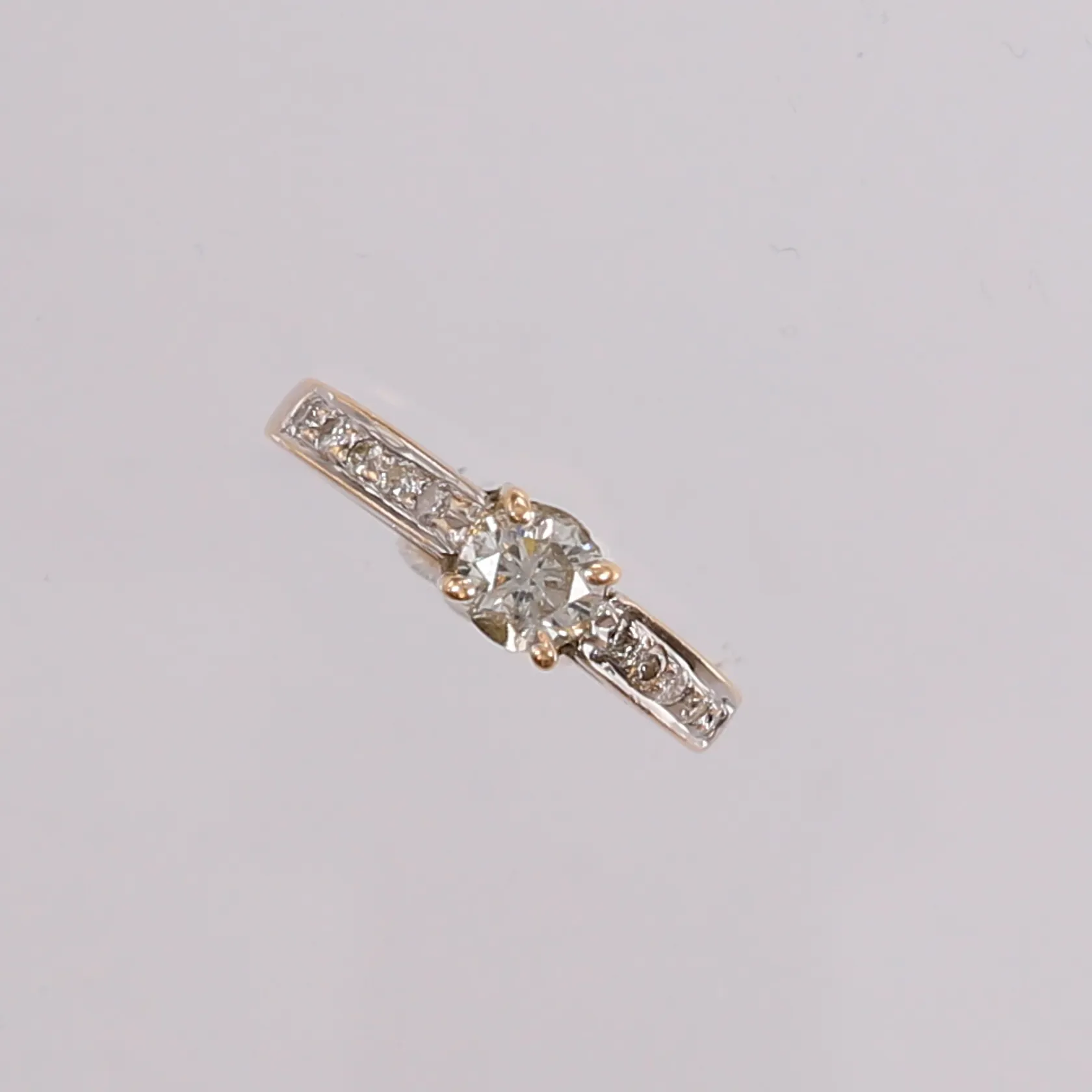 Ring med briljantslipte diamanter (1 x ca. 0,65ct muligens syntetisk diamant og 10 x ca. 0,02ct), ø17,6mm, bredde 2,4- 5,5mm, hvitt gull (slitt rhodinering), 14K Vekt: 3,9 g. Kontakt Lånekontoret for frakt.