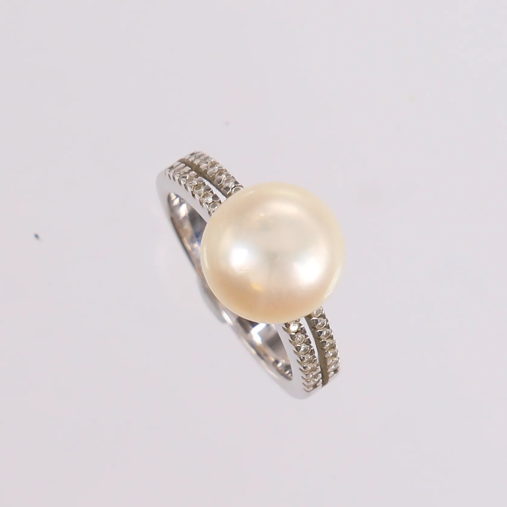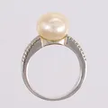 Ring med 28 diamanter (totalt 0,14ct iht. gravering) og perle, ø17,3mm, bredde 3,1- 10,9mm, hvitt gull, 14K, bruttovekt 5,7g Kontakt Lånekontoret for frakt.