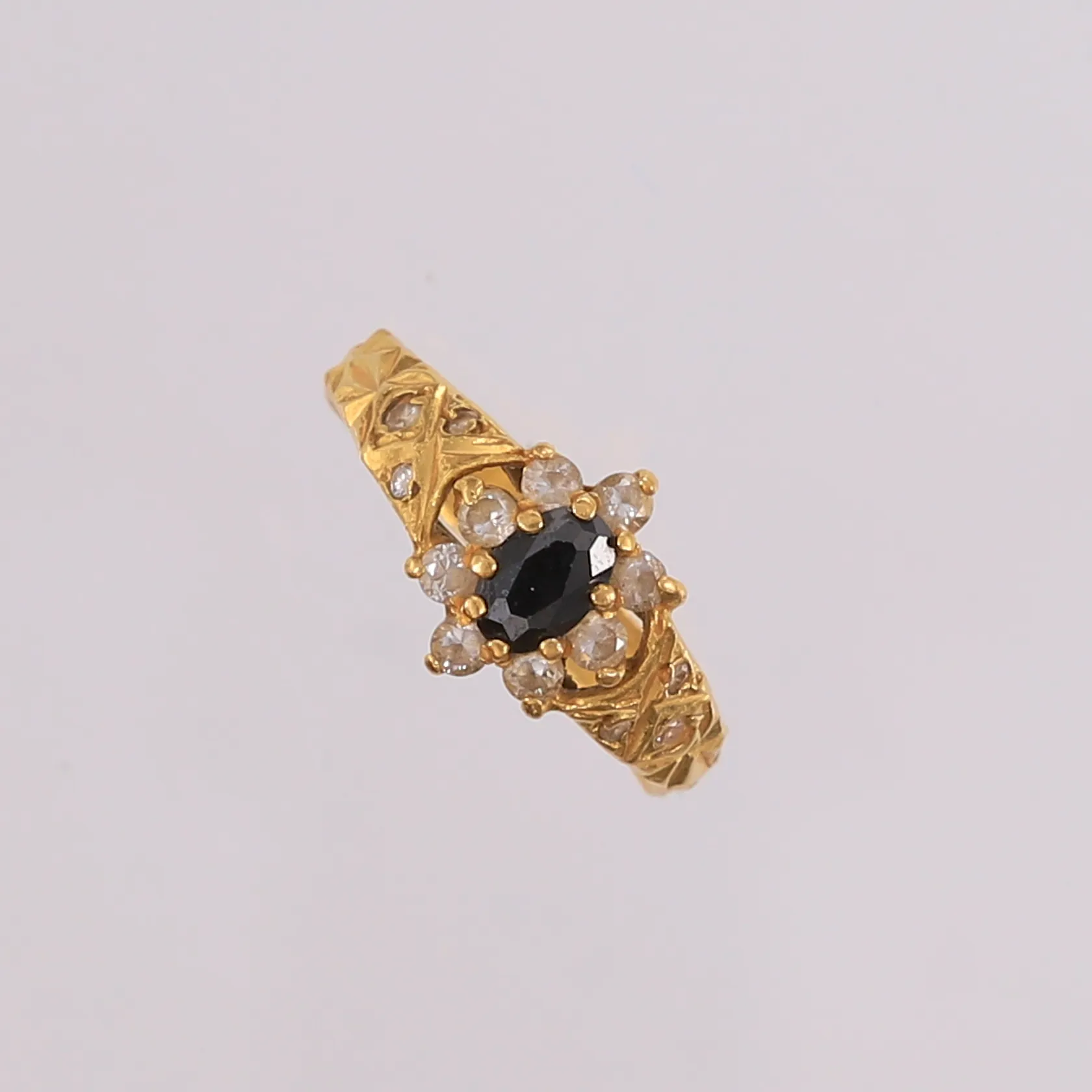 Ring med blå og blanke stener, ø18,7mm, bredde 3,2- 10,8mm, noe bulkete, 22K Vekt: 4,1 g. Kontakt Lånekontoret for frakt.