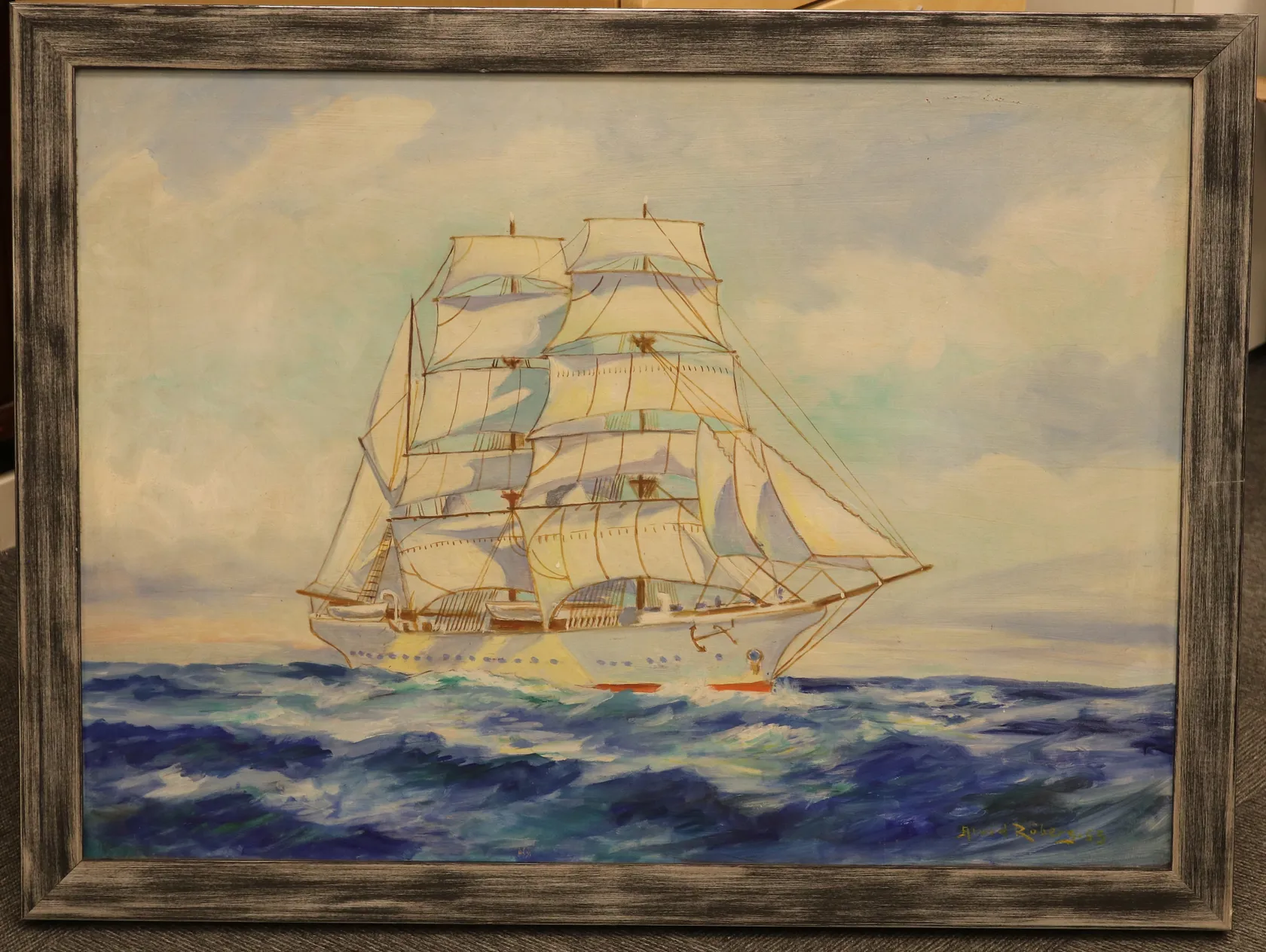 Oljemaleri av seilskute, Arild Røberg, med treramme, Format: 78 x 58cm, motivformat: 70 x 50cm Kontakt Lånekontoret for frakt.