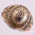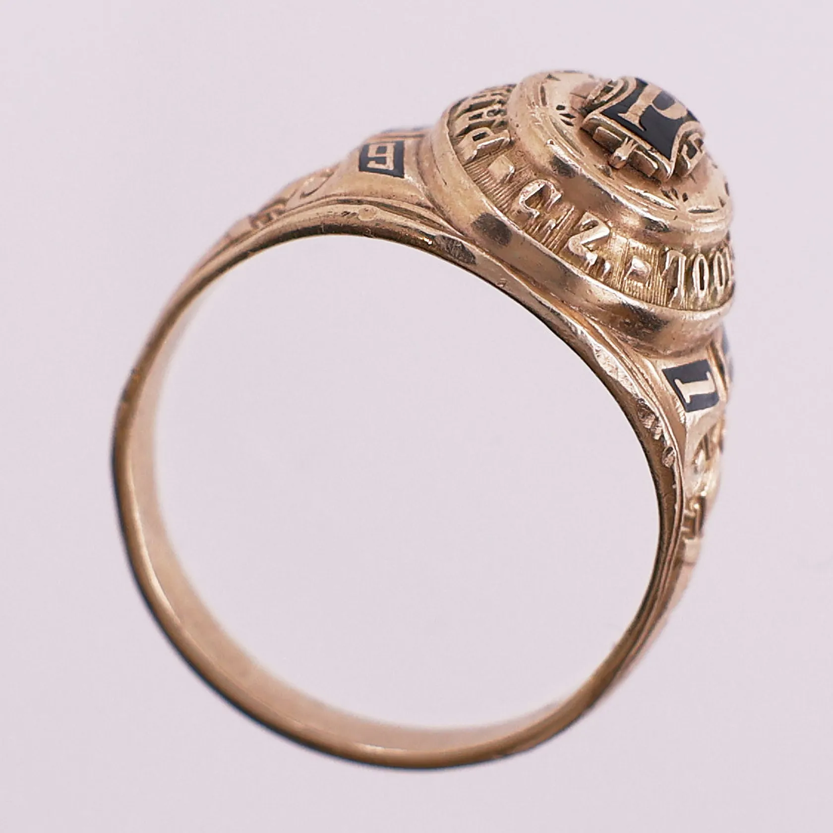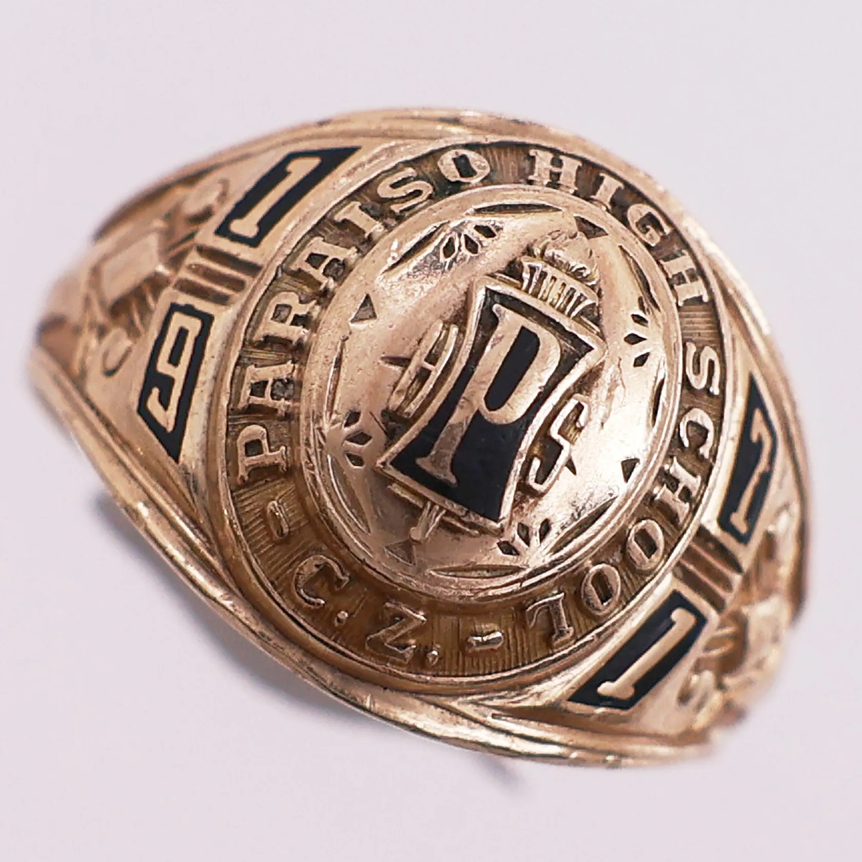 Ring Paraiso High School, Ø 21,5 mm, bredde 3,7 - 17,3 mm, gravert, 10K Vekt: 11 g. Kontakt Lånekontoret for frakt.