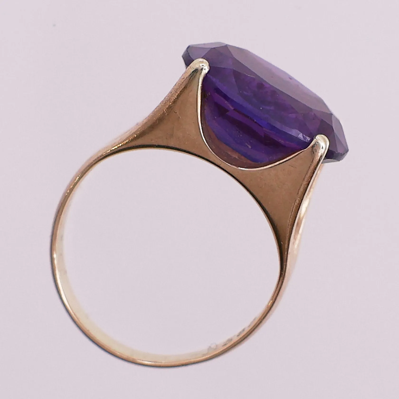 Ring med lilla sten, Ø 15,7 mm, bredde 2,4 - 11,6 mm, 14K Vekt: 5,4 g. Kontakt Lånekontoret for frakt.