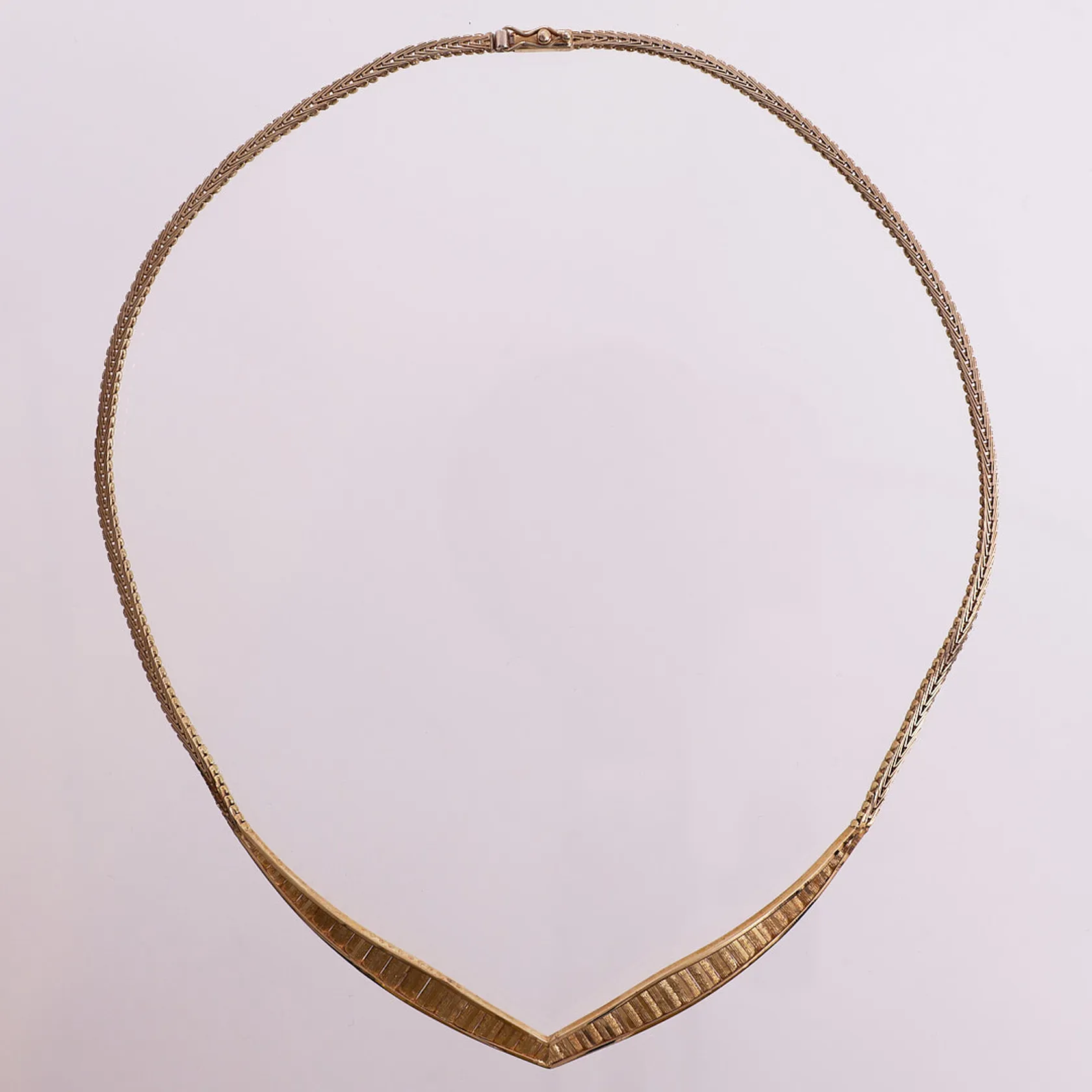 Halssmykke chevron, lengde 39 cm, bredde 2,7 - 6,4 mm. 14K Vekt: 16,5 g. Kontakt Lånekontoret for frakt.