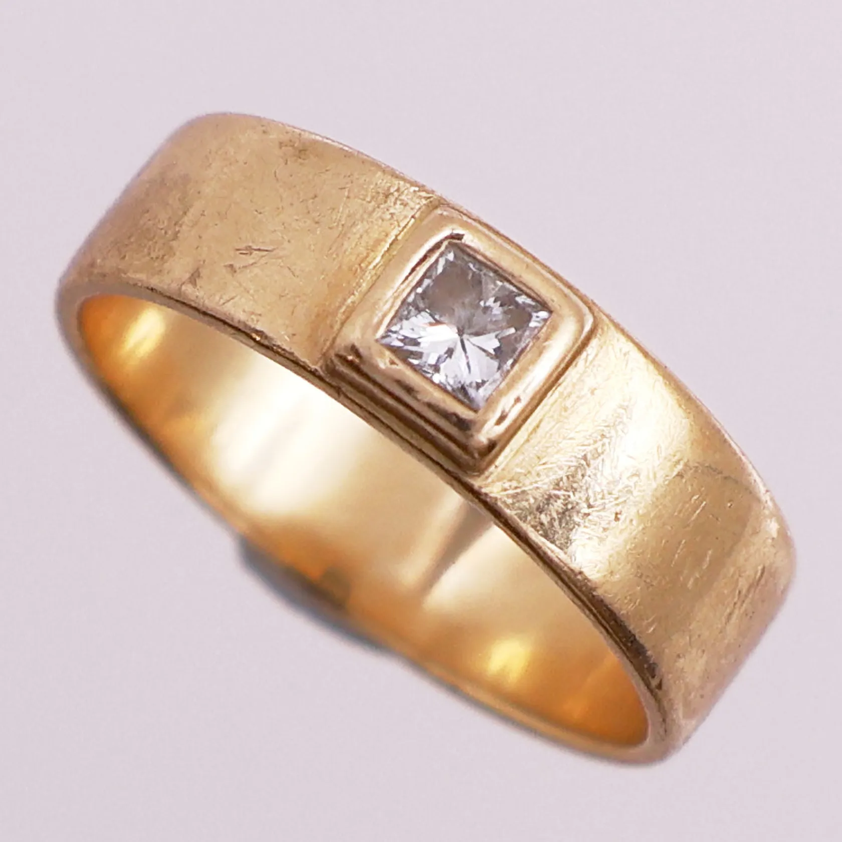 Ring med diamant 1 x ca 0,15 ct, Ø 18 mm, bredde 5,4 mm, mangler stempel, 18K Vekt: 5,4 g. Kontakt Lånekontoret for frakt.