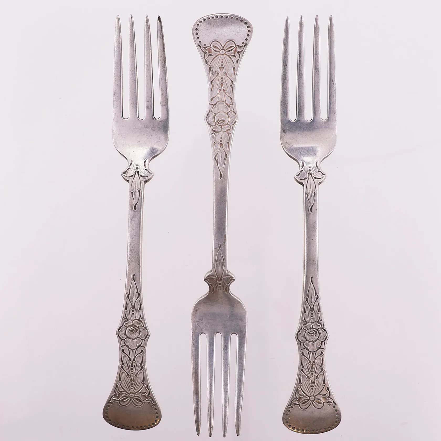 3 gafler Flat rose, lengde 17 cm, gravert, 830S Vekt: 112,3 g. Kontakt Lånekontoret for frakt.
