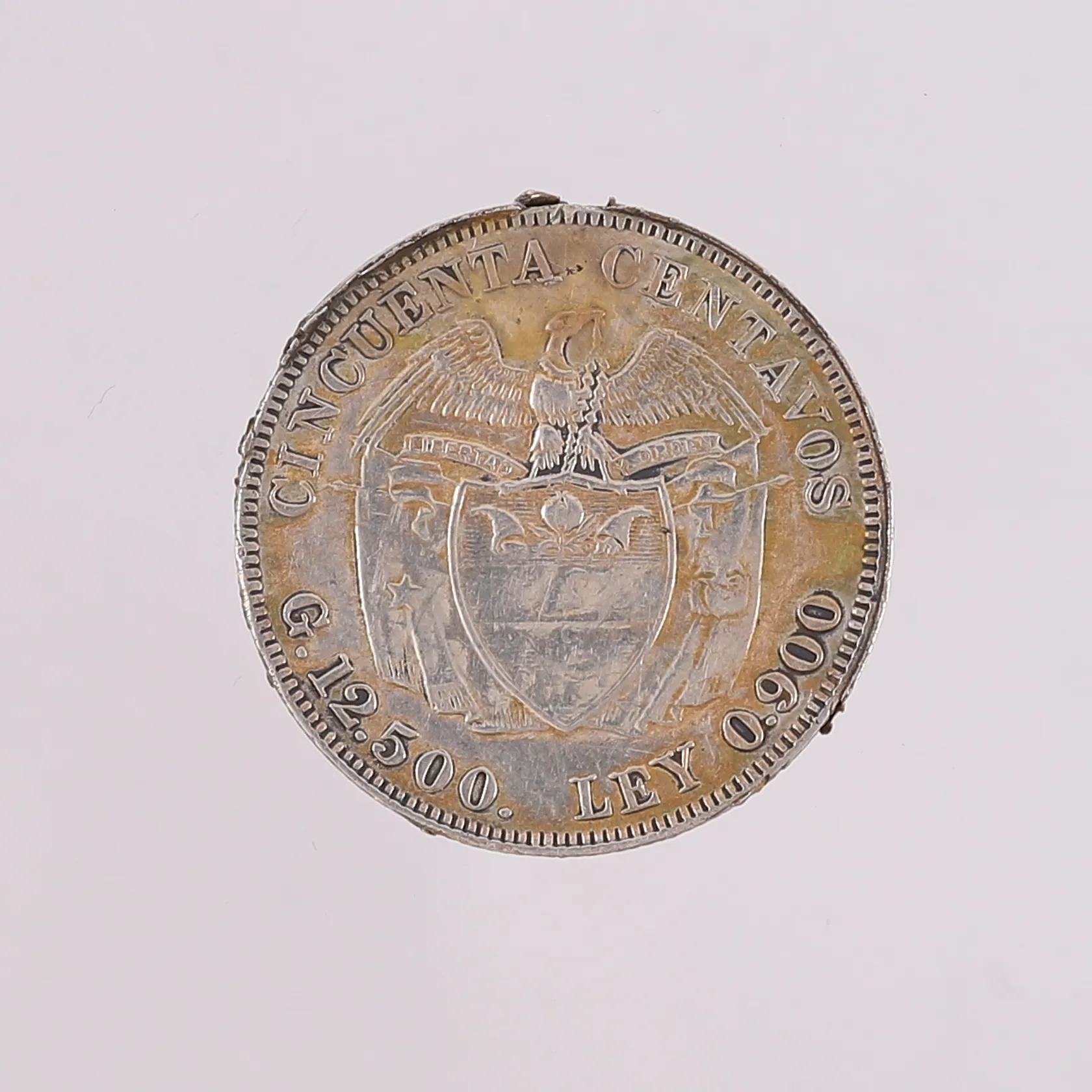 Sølvmynt, Colombia, 50 centavos, år 1915, mynten har skader, S 900/1000 Vekt: 12,6 g. Kontakt Lånekontoret for frakt.
