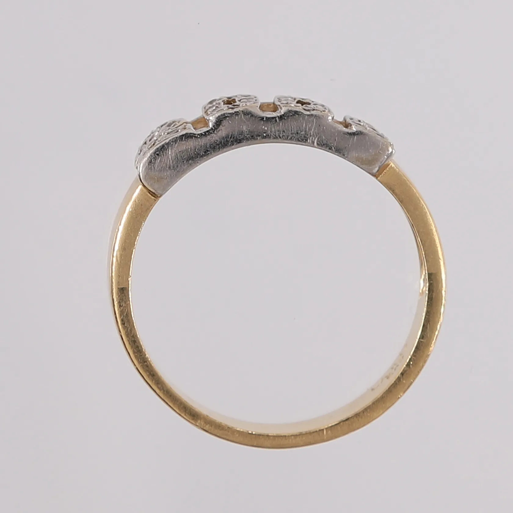 Ring "år 2000" med diamanter (6 x ca. 0,005ct) og blanke stener, to-farget, ø18,4mm, bredde 4- 5,9mm, 14K, bruttovekt 4,5g Kontakt Lånekontoret for frakt.