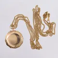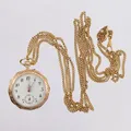 Lommeur i gull med lenke, karabinen er i gull med perle og smaragd, diameter 36mm, boettnummer 63134-41, urverket går, 14K, bruttovekt 68,3g Kontakt Lånekontoret for frakt.