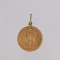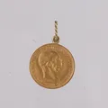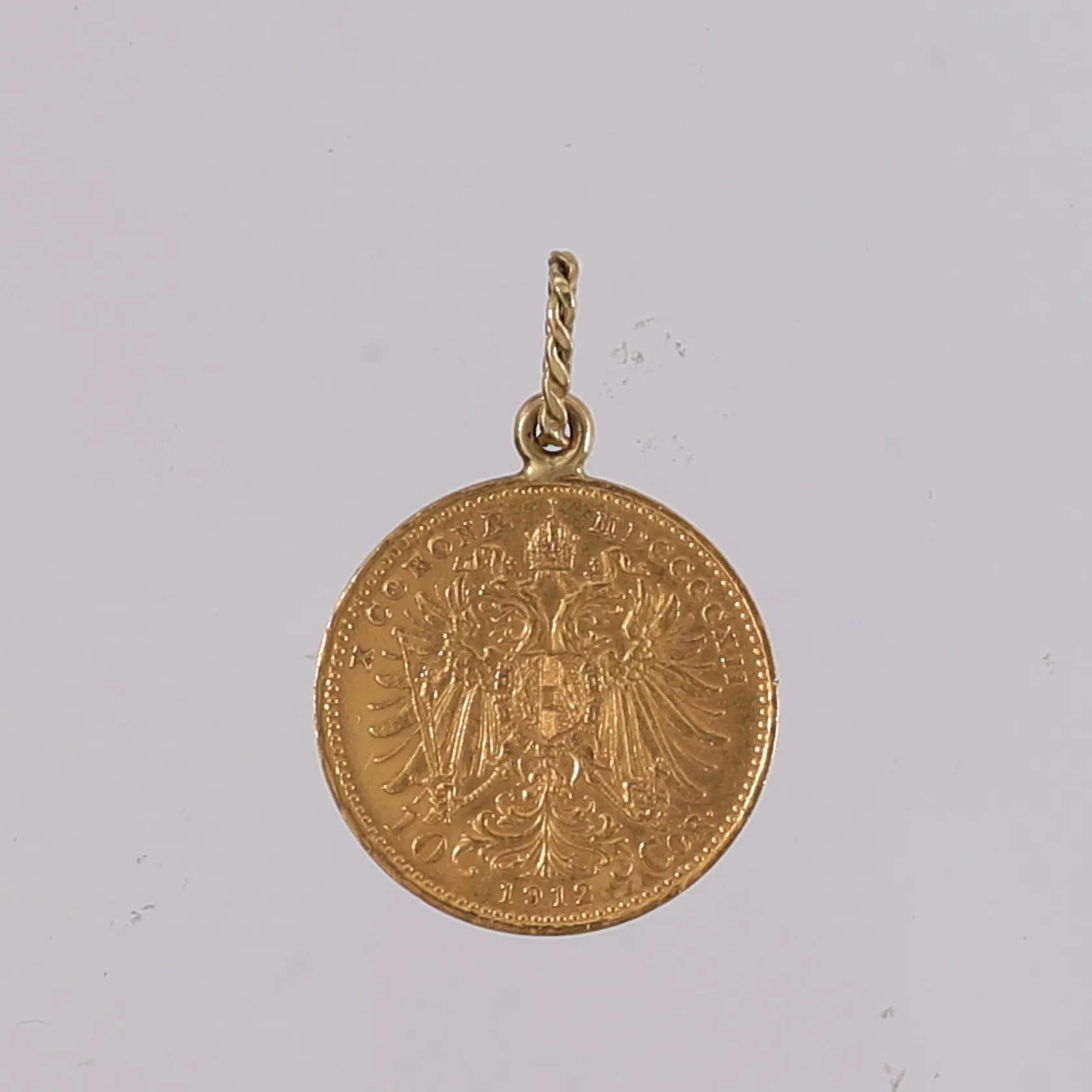 Anheng med medalje/mynt Frans Josef I, år 1912, ø20mm, 22K (festering er 14K), bruttovekt 3,6g Vekt: 3,6 g. Kontakt Lånekontoret for frakt.