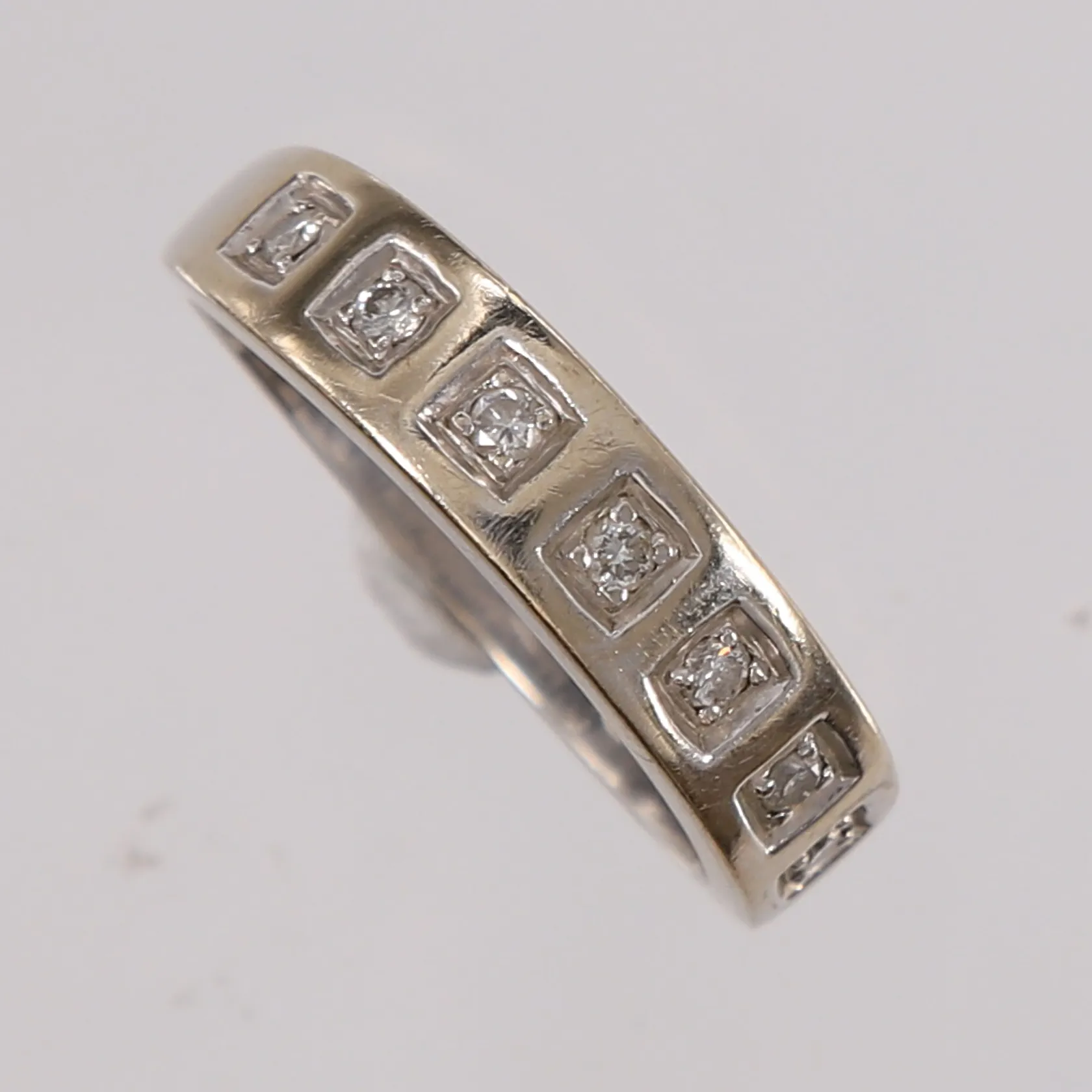 Ring med 7 diamanter totalt 0,20ct iht. gravering, ø19,6mm, bredde 2,2- 5,3mm, noe slitt rhodinering, hvitt gull, 14K Vekt: 4,6 g. Kontakt Lånekontoret for frakt.