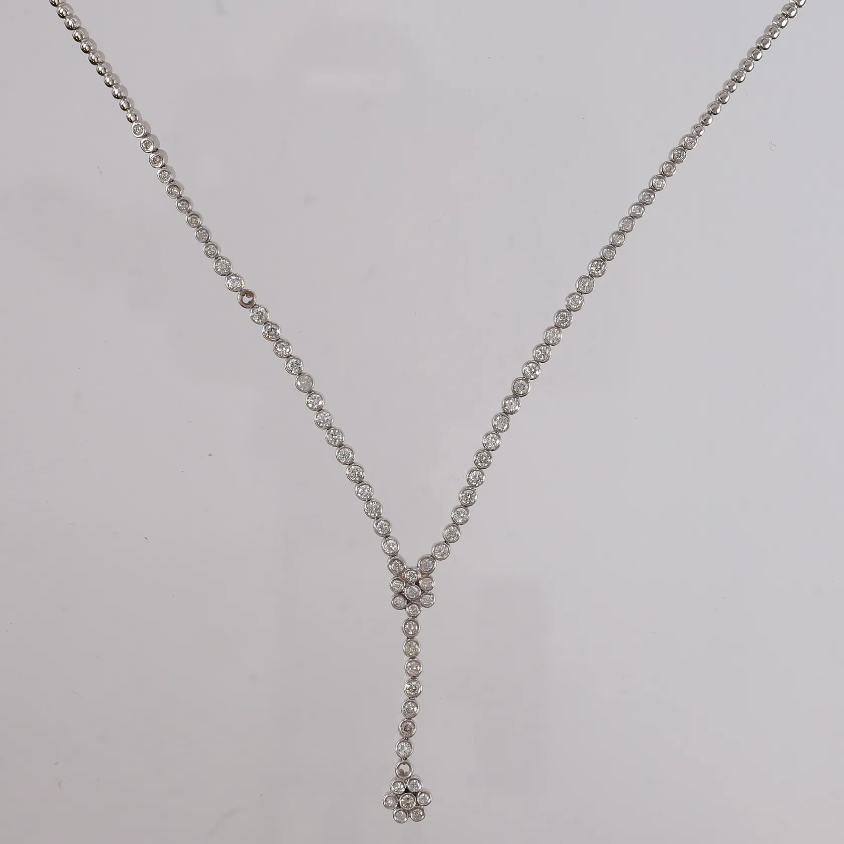Halssmykke med 74 diamanter totalt ca. 1,10ct, lengde ca. 45cm, bredde 1,8- 2,7mm, 2 stener mangler, defekt lås (sikkerhetslås fungerer), hvitt gull, 18K. Vekt: 17 g. Kontakt Lånekontoret for frakt.