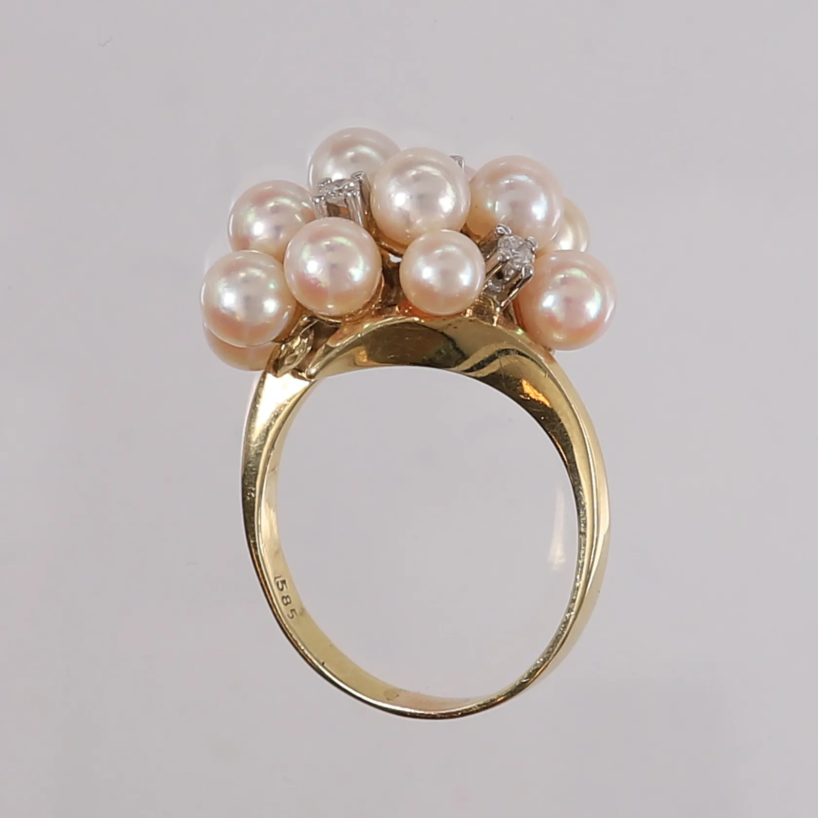 Ring med 12 perler og diamanter 4 x ca. 0,04ct, ø19,2mm, bredde 1,8- 22,7mm, 14K, bruttovekt 8,2g Kontakt Lånekontoret for frakt.
