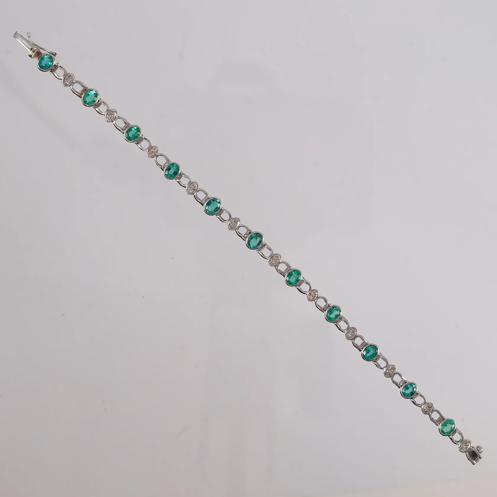 Armbånd med diamanter 22 x ca. 0,03ct og grønne stener, lengde 18,5cm, bredde 3,8- 6mm, hvitt gull, 18K. Vekt: 11,8 g. Kontakt Lånekontoret for frakt.
